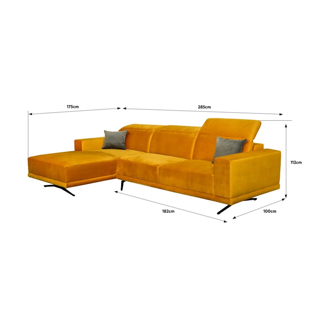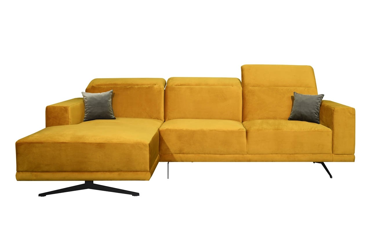 Kotna sedežna garnitura PONTI je modernega izgleda in v izjemno vpadljivi rumeni barvi, ki bo vaš dnevni prostor poživela. Sedišča so izredno udobna, saj so napolnjena s peno in valovitim vzmetenjem. Celotna sedežna pa je oblečena v tkanino in vsebuje funkcijo nastavljivih naslonov za glavo. Maksimalna obremenitev posameznega sedišča znaša 100 kg. Garnitura stoji na kompletu črnih nogic.