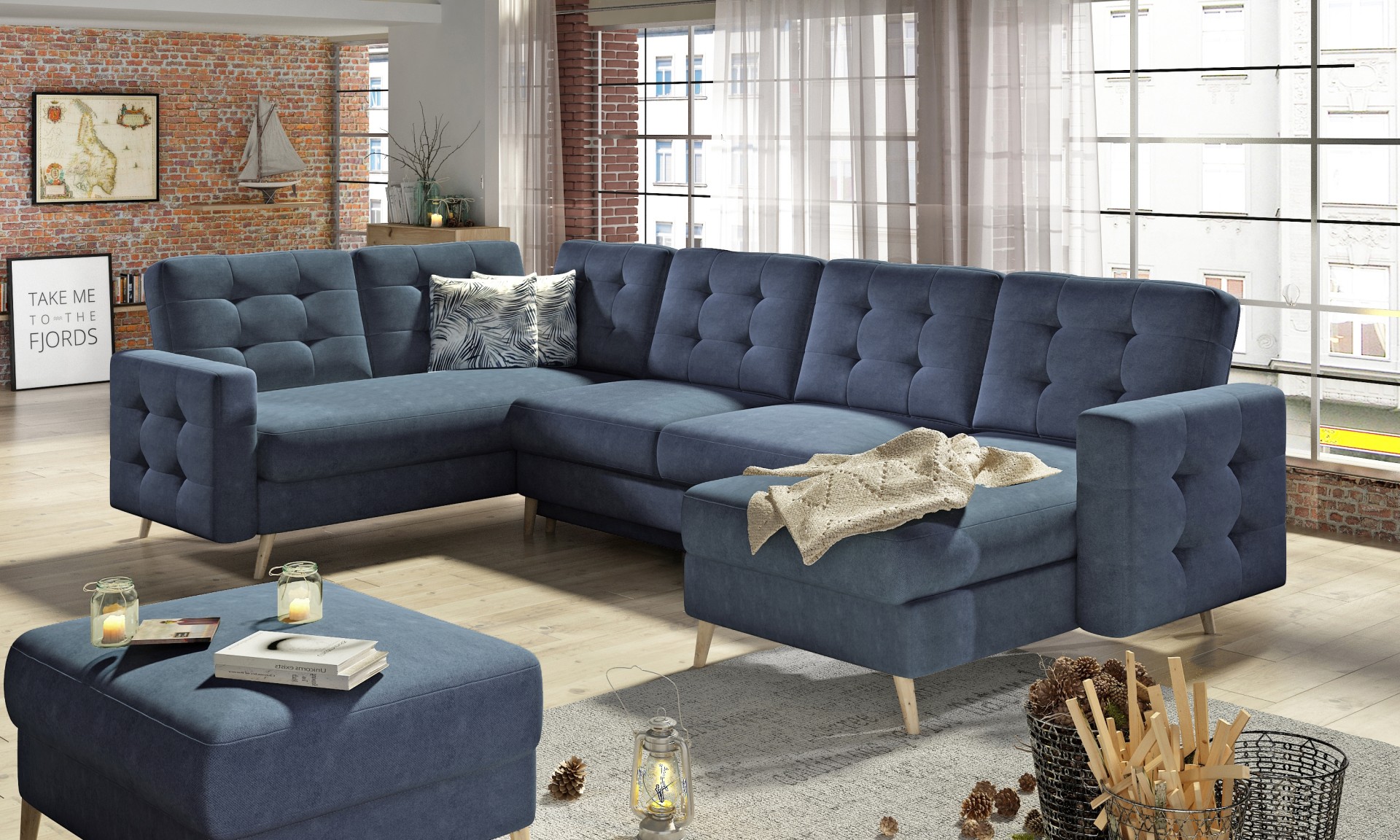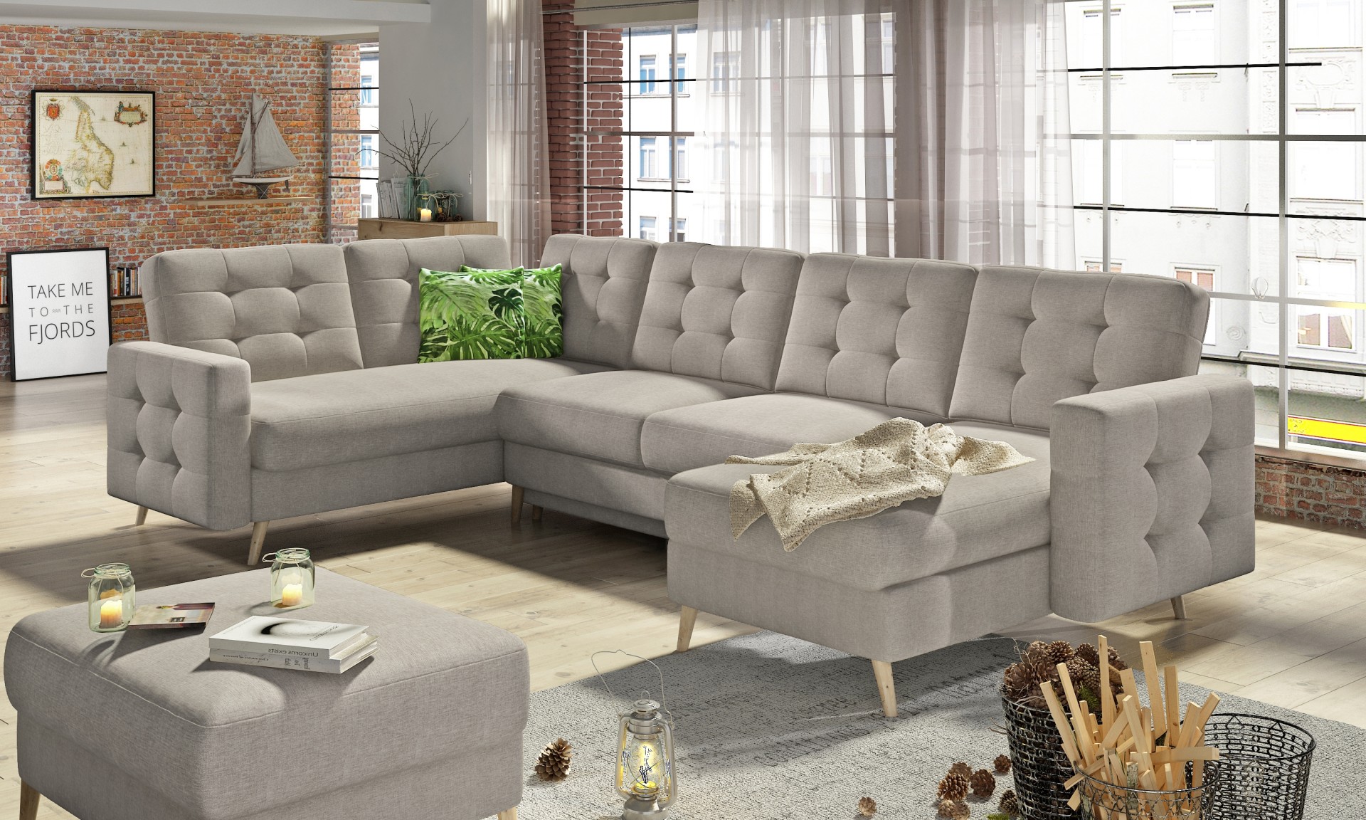 Sedežna garnitura RETRO U je izjemno prostorna zato lahko na njej brezskrbno počivajo vsi družinski člani in se medtem počutijo prijetno in udobno. Ima vgrajeno tudi izjemno prostorno dodatno ležišče, katerega z lahkoto uporabite v kolikor želite več prostora za bolj udoben počitek med gledanjem televizije, branjem, in podobno, ali pa potrebujete dodatno ležišče za vaše goste. RETRO U je izdelana iz kakovostne pene in valovitega vzmetenja, ki poskrbita za maksimalno udobje med sproščanjem na sedežni garnituri. Valovito vzmetenje poskrbi tudi daljšo obstojnost sedežne garniture za večletno brezskrbno uporabo.