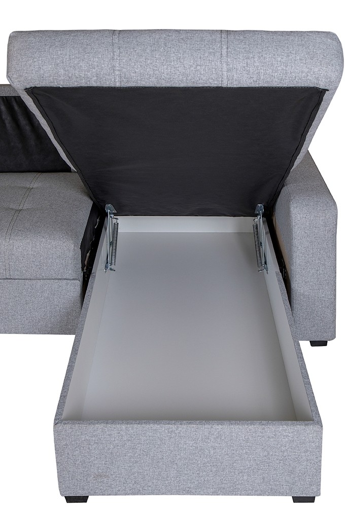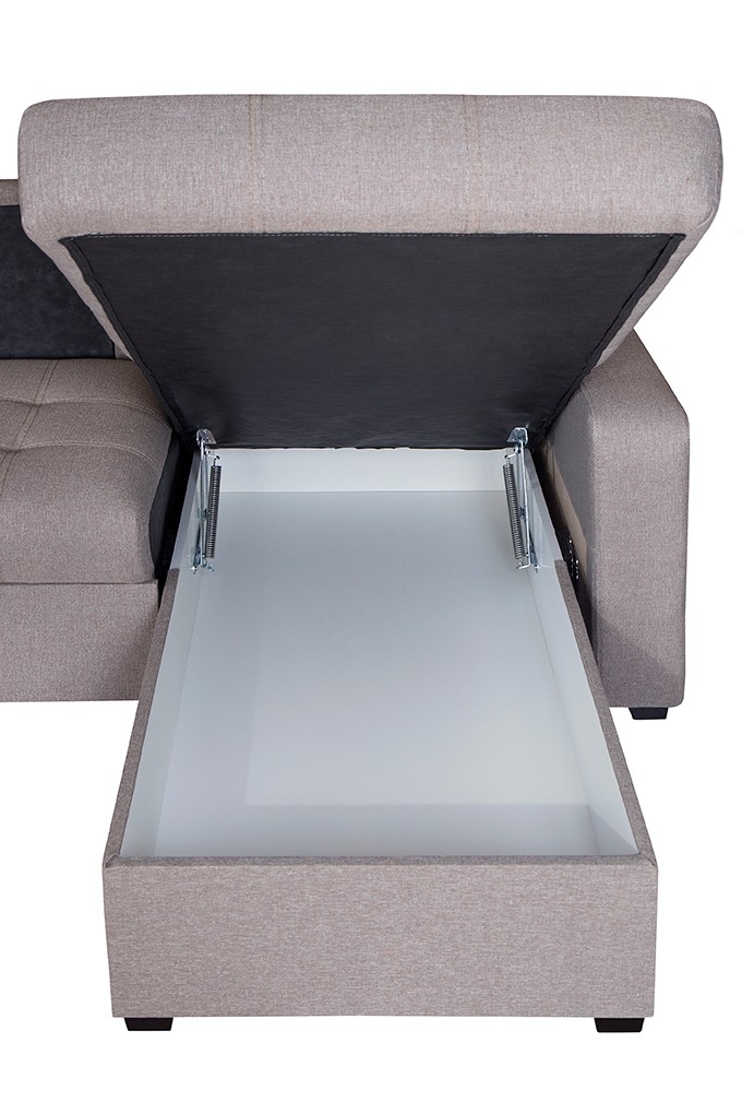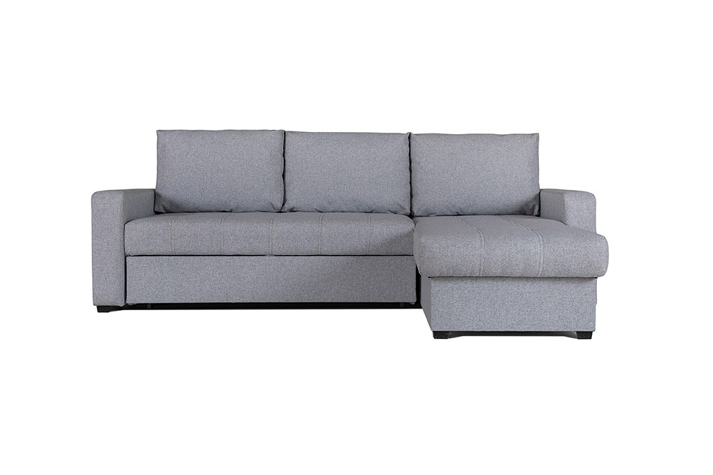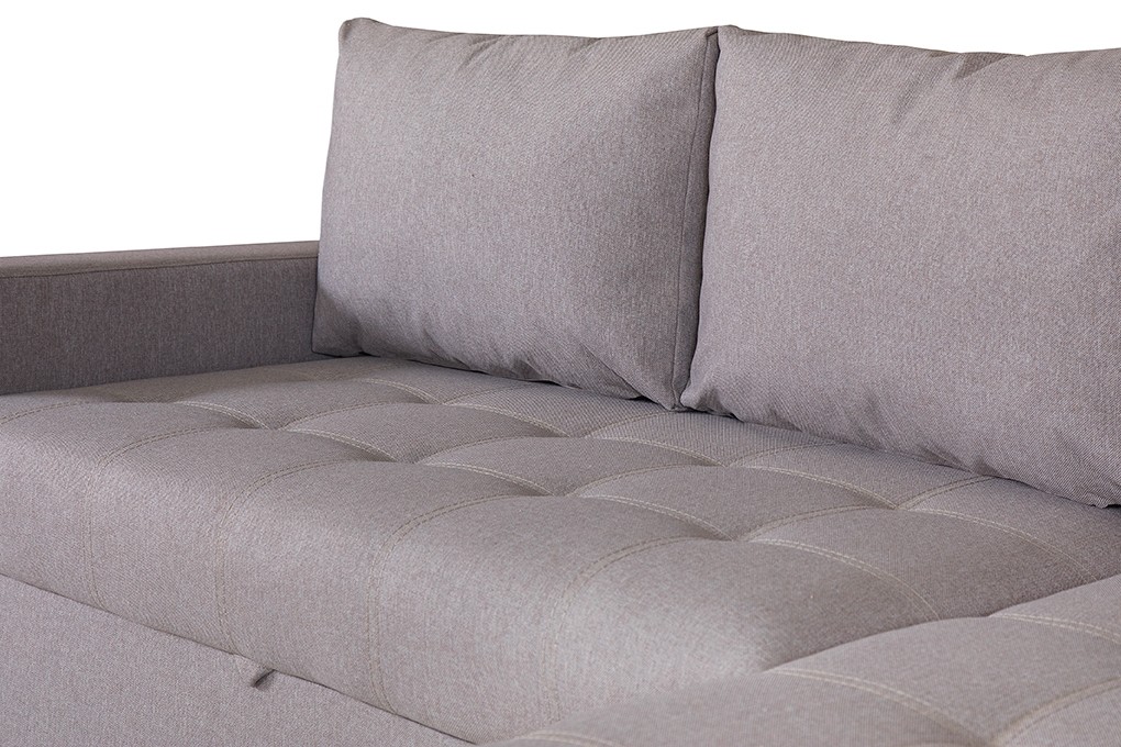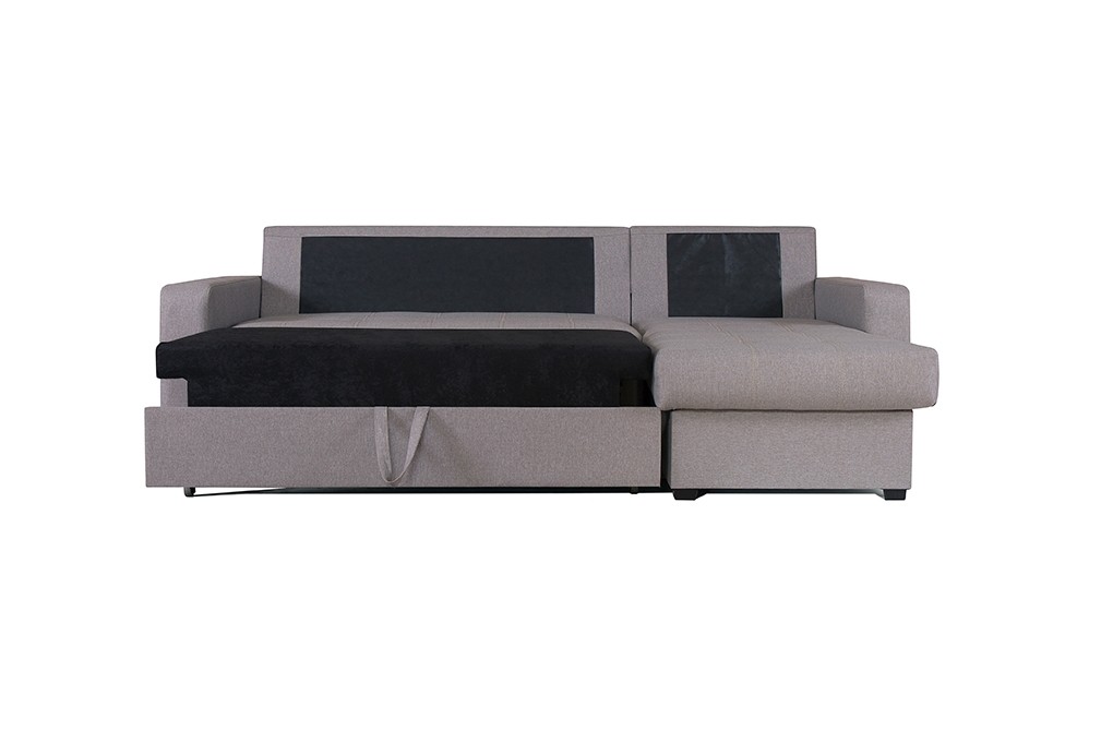 Univerzalna kotna sedežna garnitura SARIA je obrnljiva, kar pomeni da lahko podaljšani del namestite na levo ali na desno stran, zato si jo lahko prilagodite vašim željam in potrebam. Na voljo je v nežni sivi in rjavi barvi, ki ji nudita moderni videz in kateri se z lahkoto kombinirata z ostalimi barvami. Vsebuje izvlečno ležišče in praktični zaboj za shranjevanje vzglavnikov, odej in posteljnine za morebitne goste.