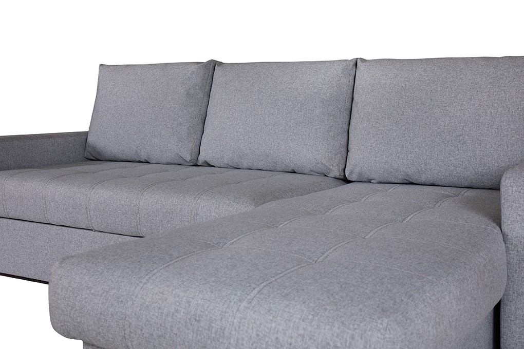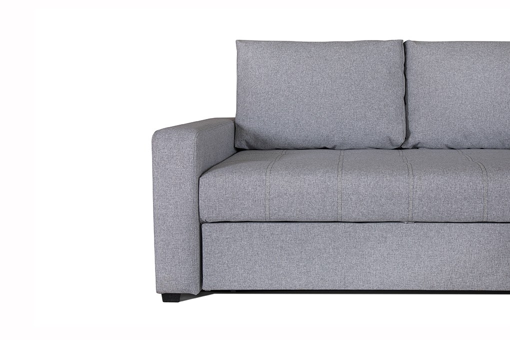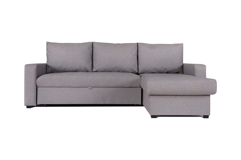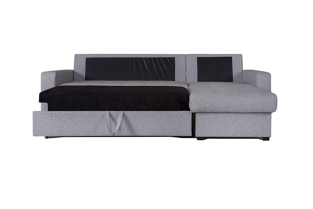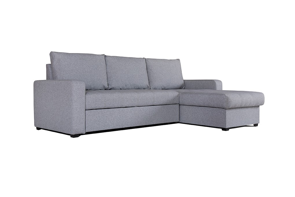 Univerzalna kotna sedežna garnitura SARIA je obrnljiva, kar pomeni da lahko podaljšani del namestite na levo ali na desno stran, zato si jo lahko prilagodite vašim željam in potrebam. Na voljo je v nežni sivi in rjavi barvi, ki ji nudita moderni videz in kateri se z lahkoto kombinirata z ostalimi barvami. Vsebuje izvlečno ležišče in praktični zaboj za shranjevanje vzglavnikov, odej in posteljnine za morebitne goste.