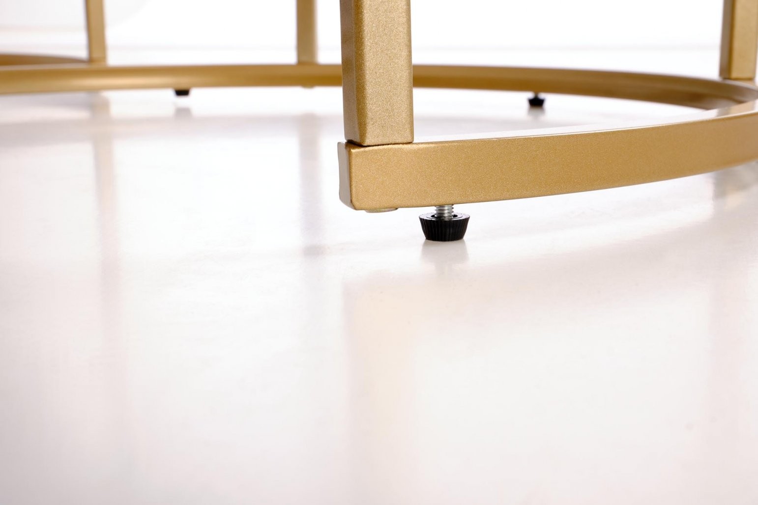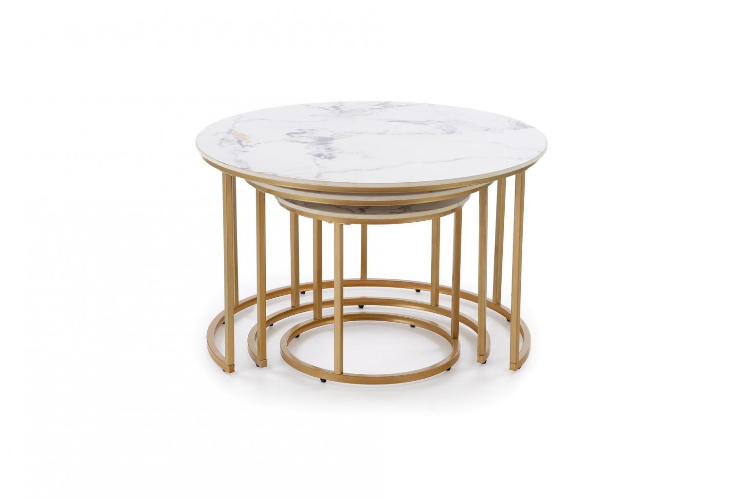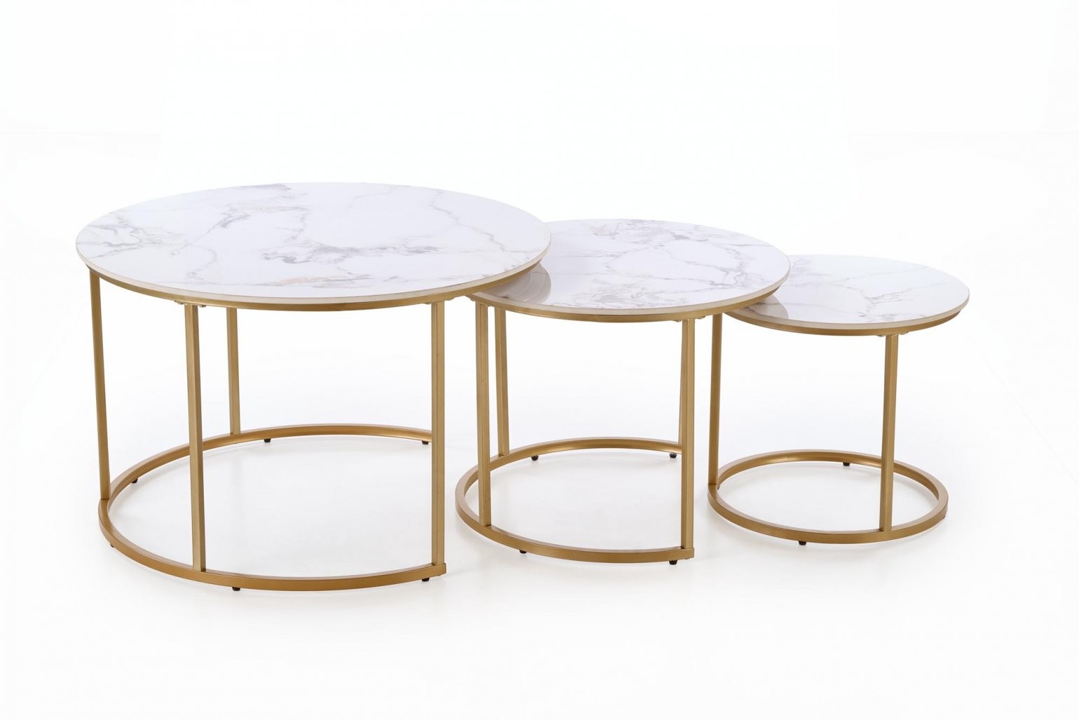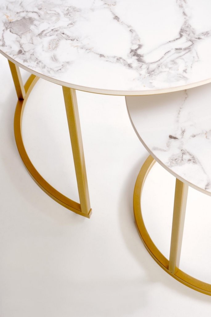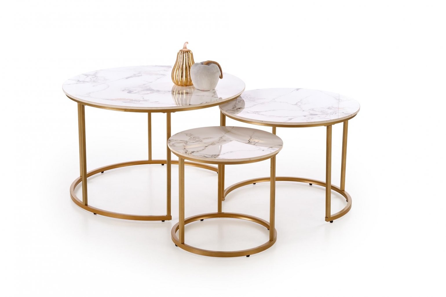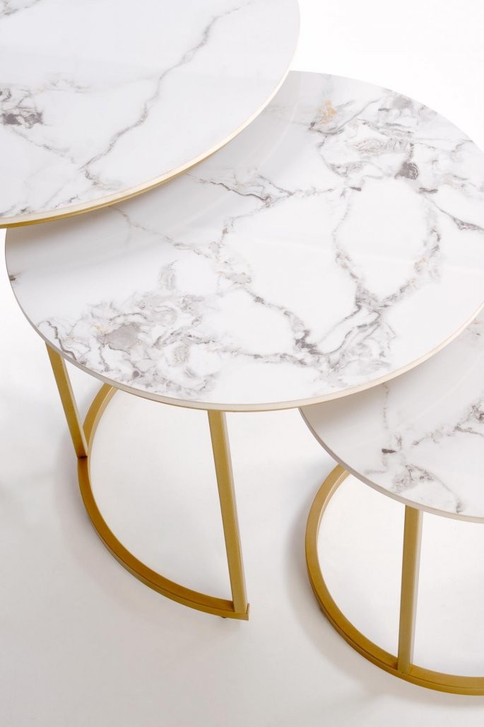 Mizice so izdelane iz sintranega kamna in prašno lakiranega jekla, kar zagotavlja visoko trpežnost in odpornost na vsakodnevno uporabo. Njihova brezčasna kombinacija barv, ki vključuje bel marmor in zlato, poudarja prefinjen in sodoben videz. Ne glede na to, ali potrebujete prostor za kavo, revije ali dekoracijo, Set 3 klubskih mizic Parun je odlična izbira, ki združuje estetiko in praktičnost.