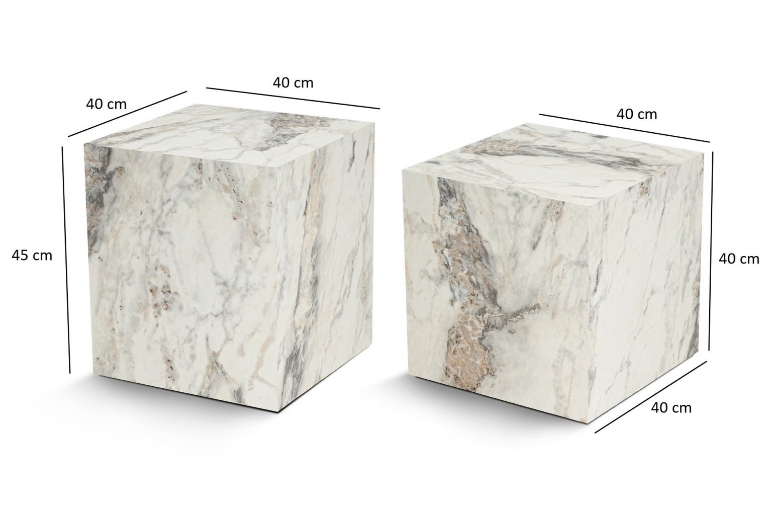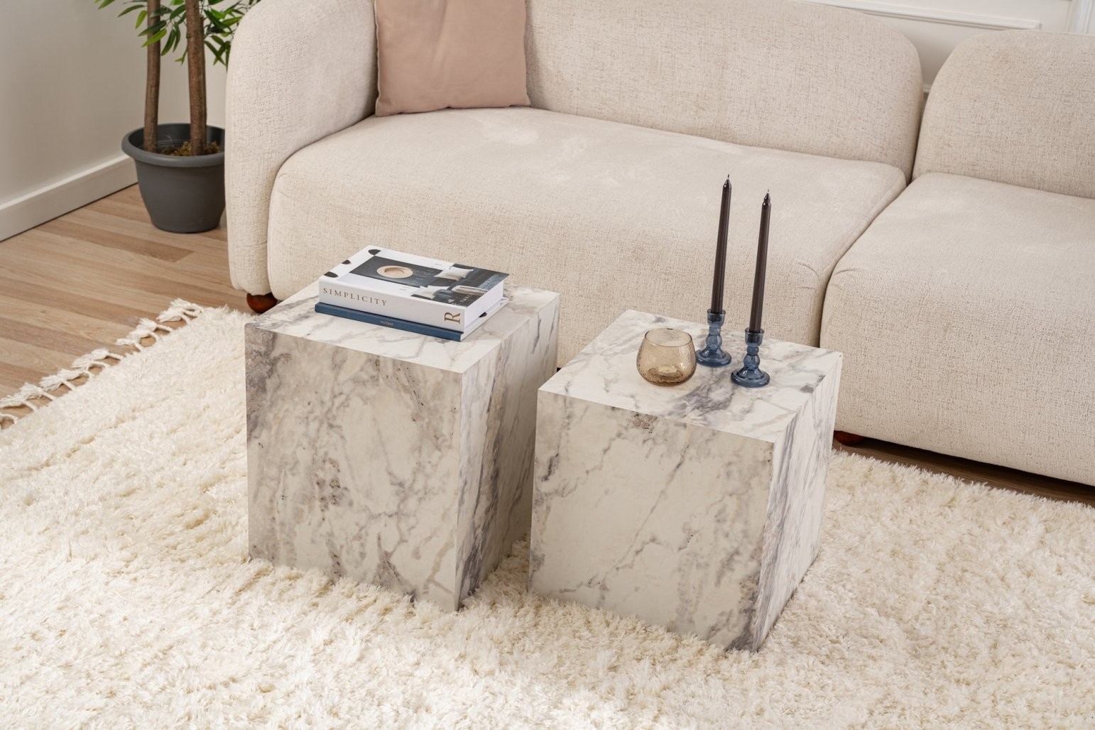 Predstavljajte si, da se vrnete domov v prostor, ki izžareva razkošje in stil. Naš set stranskih miz Noran v freesia marmor barvi Marble je zasnovan tako, da dvigne vašo dnevno sobo, doda pridih glamurja in čara. Sijajna marmorirana površina izžareva razkošje, medtem ko sodoben dizajn dopolnjuje vsak slog dekoracije.