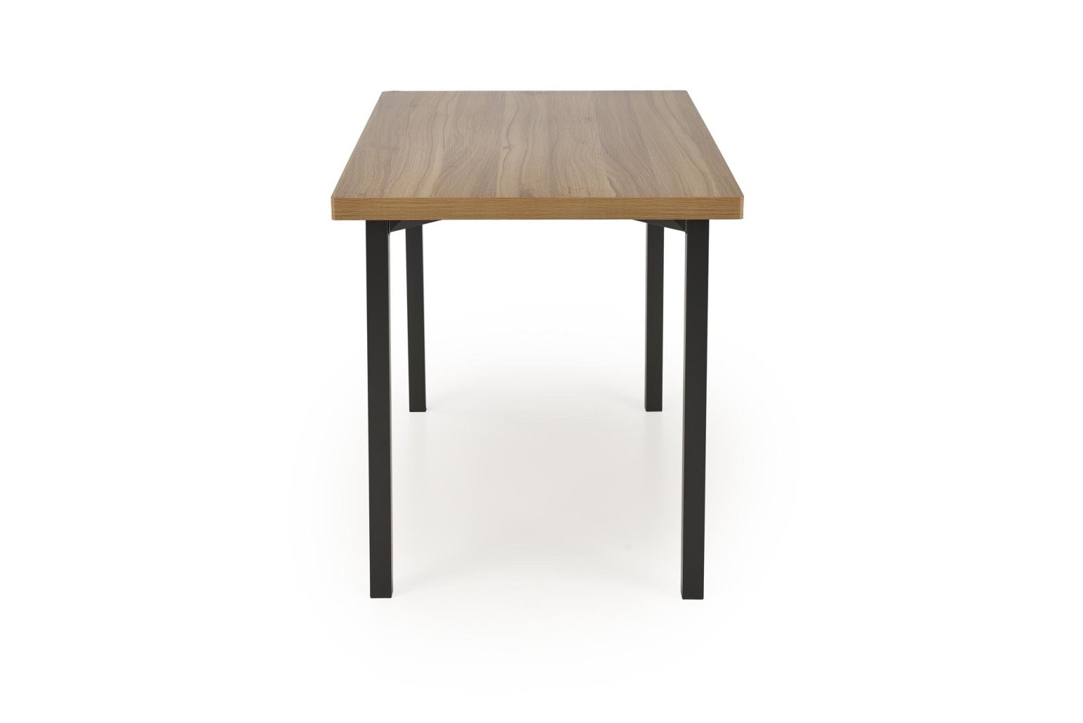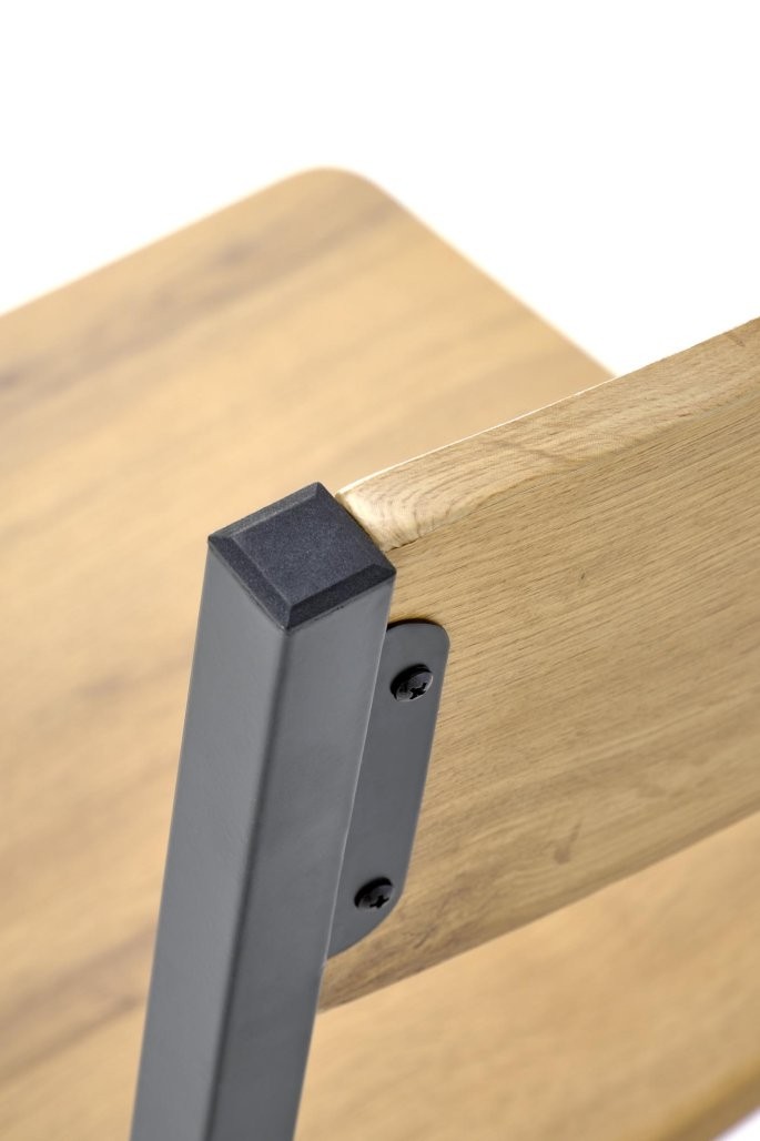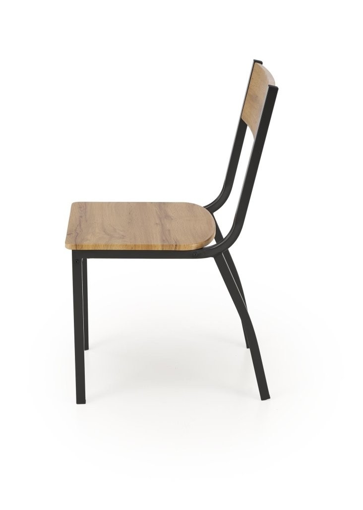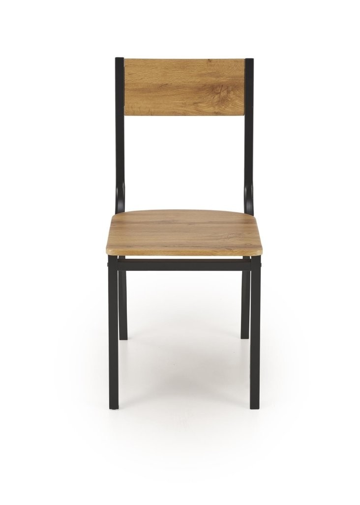 Jedilni set Inar, ki vključuje mizo in štiri stole, s črnim kovinskim okvirjem in površinami iz laminirane plošče v naravnem videzu. Sodoben dizajn za jedilnice ali kuhinje.