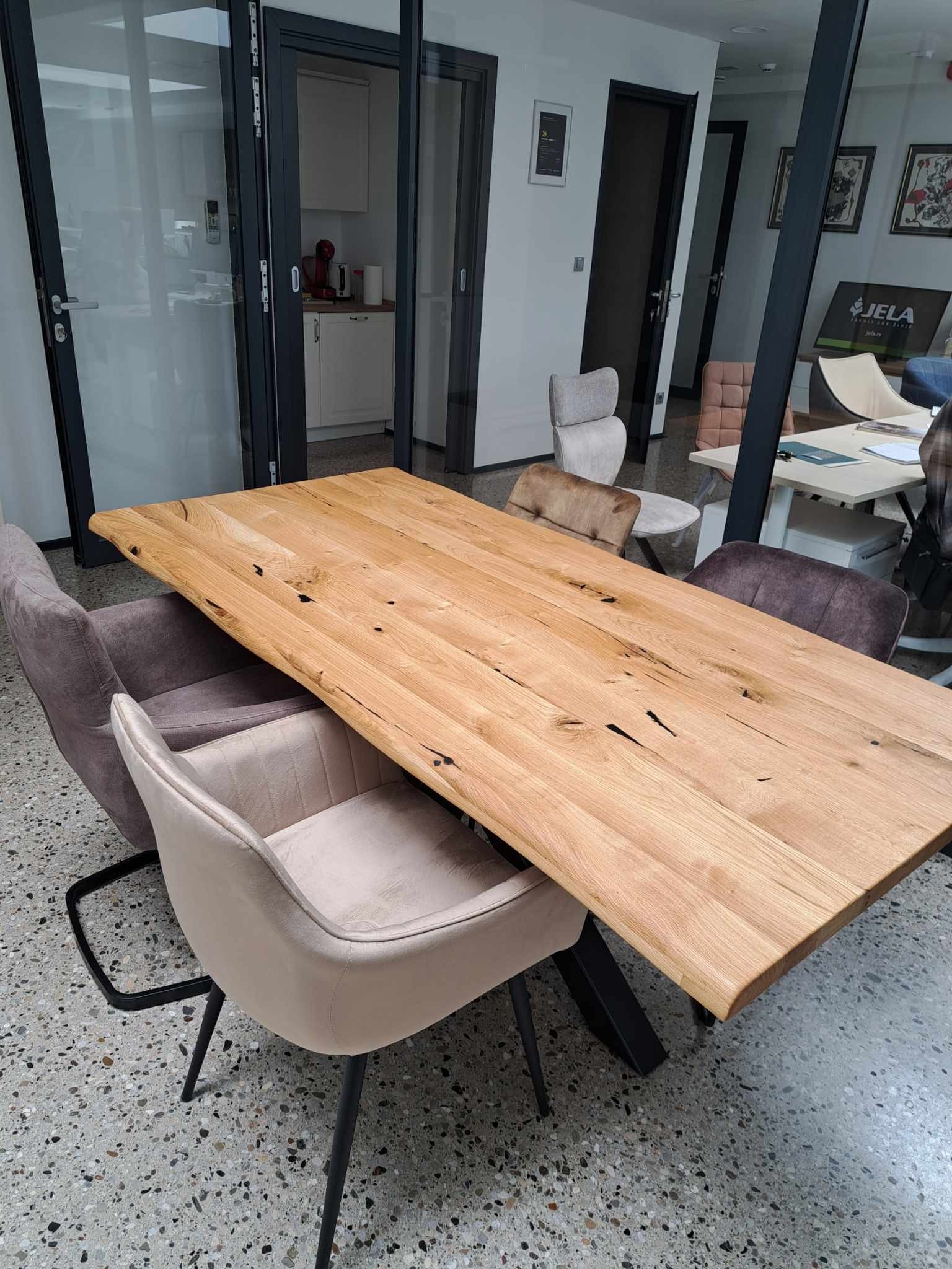 Miza in stoli so razstavni eksponati v showroom-u v Ljubljani. Izdelki nimajo vidnih poškodb in so v odličnem stanju.
