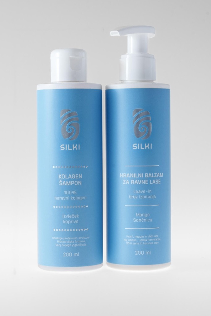 V popolnem setu za nego ravnih las najdete SILKI kolagen šampon in leave-in balzam brez izpiranja. Njuna kombinacija bo poskrbela, da bodo vaši ravni lasje ponovno nahranjeni, močni ter mehki in sijoči. Obe formulaciji temeljita na vodi osnovi zato las ne obtežita in jim samo pomagata vrniti mladostni izgled.