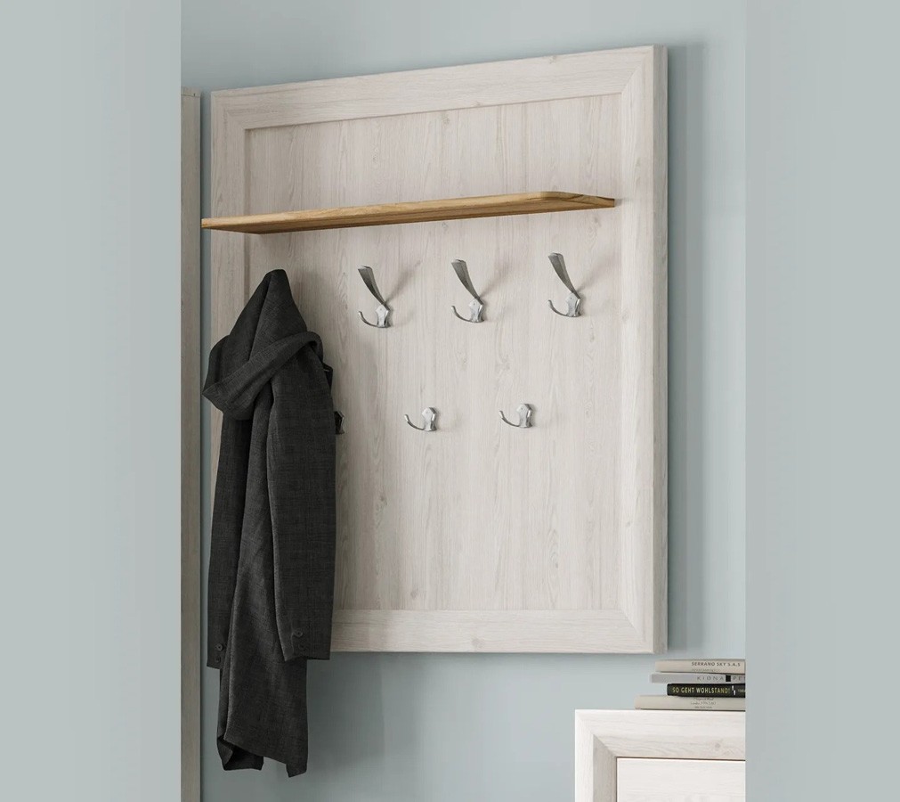Širok obešalnik MALTA je zelo praktičen obešalnik, ki vsebuje obešalne kljukice in manjšo polico za odlaganje manjših stvari. Obešalnik je modernega izgleda in je na voljo v kombinaciji barve sibirskega macesna in oreha.