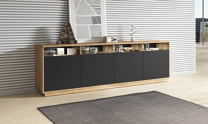 Široka komoda ASTON je na voljo v kombinaciji taurus hrast in mat črne barve, ki vam bo popestrila dnevni prostor. Komoda ima kar štiri vratca in posledično vsebuje veliko shranjevalnega prostora kamor lahko pospravite vaše družabne igre, revije in časopise.