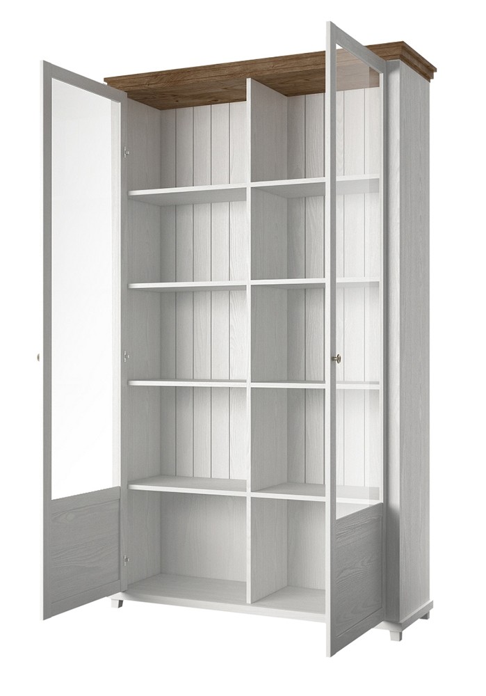 Široka vitrina EVORA je prostorna z veliko odlagalnega prostora za vaše knjige, kozarce, krožnike in ostale stvari, ki jih želite imeti v dnevni sobi na vidnem mestu. Na voljo je v abisko pepel barvi, ki se lepo poda v vsako dnevno sobo.