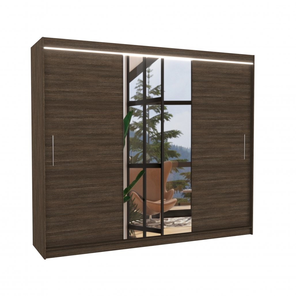 Spalna omara DENIS 250 (čokolada) je sodobna in funkcionalna rešitev za urejeno spalnico ali hodnik. S svojo drsno zasnovo, velikim ogledalom in vgrajeno LED osvetlitvijo bo vaš prostor videti večji, svetlejši in bolj organiziran.