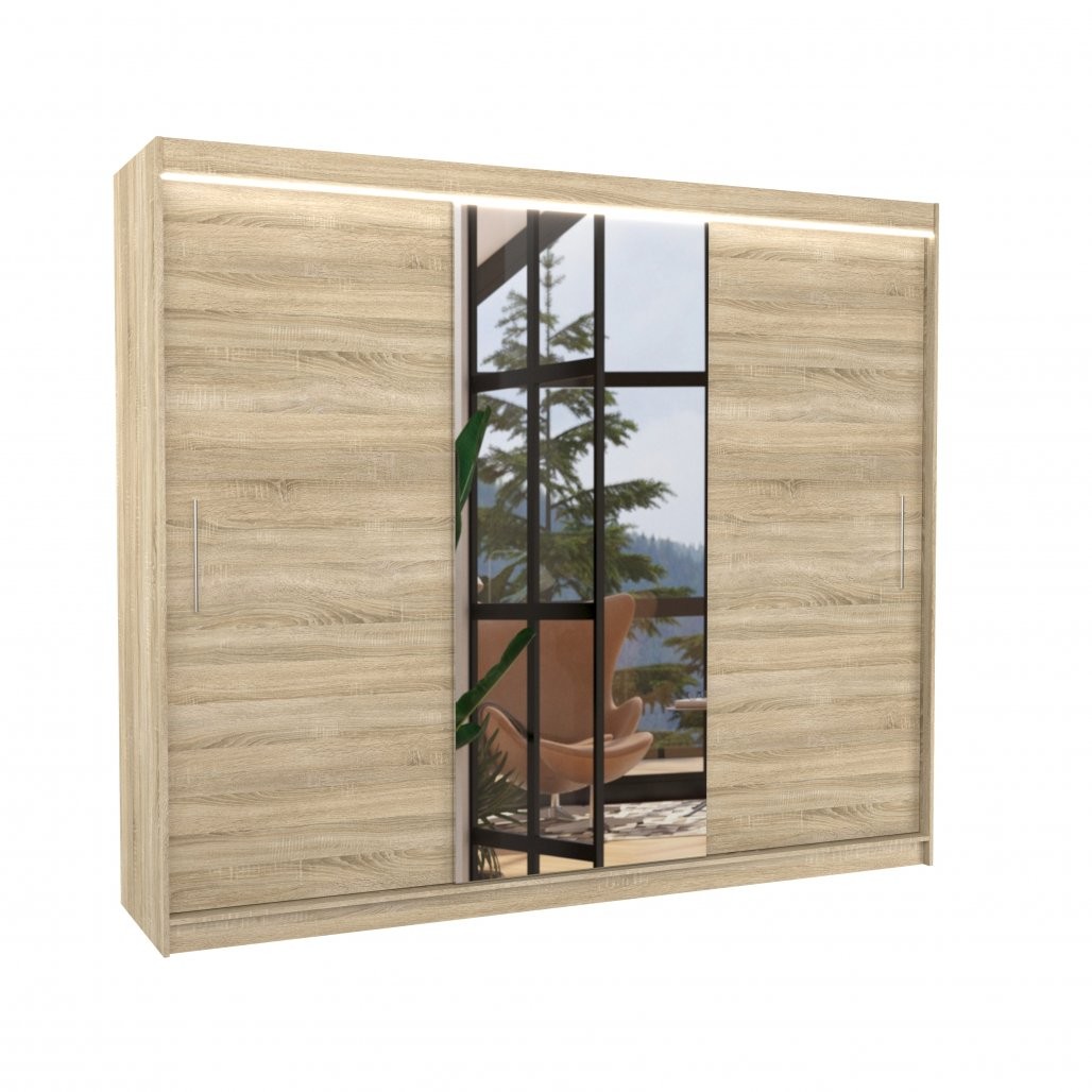 Spalna omara DENIS 250 (sonoma hrast) je sodobna in funkcionalna rešitev za urejeno spalnico ali hodnik. S svojo drsno zasnovo, velikim ogledalom in vgrajeno LED osvetlitvijo bo vaš prostor videti večji, svetlejši in bolj organiziran.