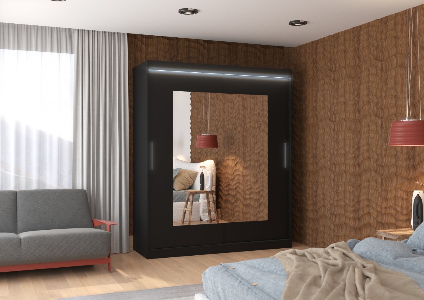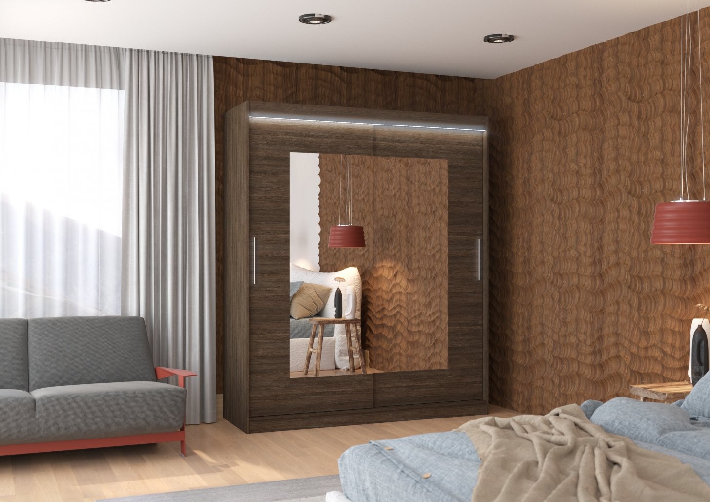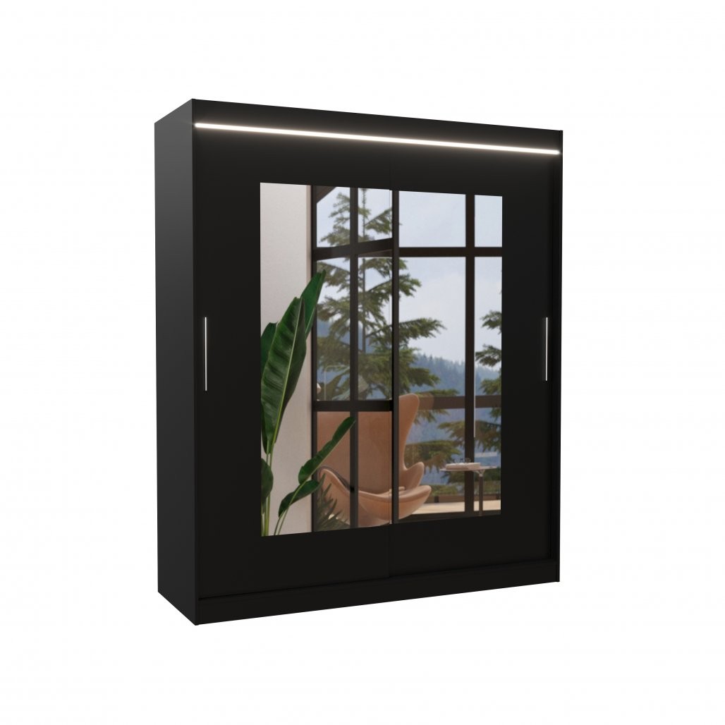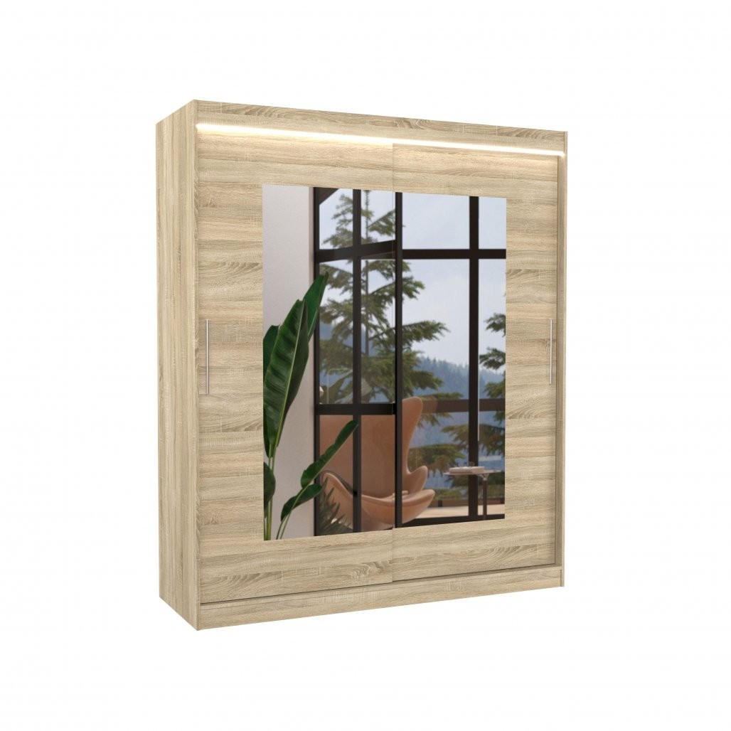 Spalna omara ROSETTE z drsnimi vrati, ogledalom in LED osvetlitvijo je popolna izbira za vse, ki želite praktično in estetsko dovršeno rešitev za shranjevanje oblačil.