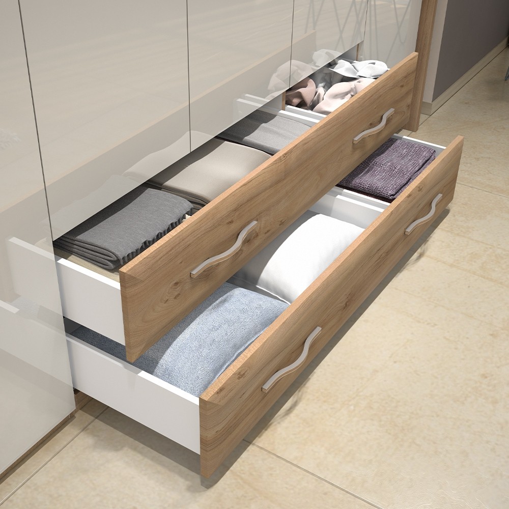 Velika garderobna omara ima dva priročna predala, notranjost pa vključuje 8 polic in 4 palice za obešanje, tako da bodo vaša oblačila vedno skrbno pospravljena in dobro organizirana.