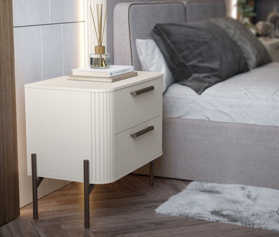 Spalnica KALLA RONDO predstavlja spoj vrhunske estetike in funkcionalnosti ter je zasnovana tako, da vašo spalnico preoblikuje v prostor elegance in udobja. Odlikujejo jo zaobljeni reliefni detajli in edinstveni ročaji z usnjenimi poudarki. V set je vključena udobna in prefinjena postelja širine 180cm, dve priročni nočni omarici, ena prostorna komoda ter 7-delna garderobna omara, pri kateri je vključena tudi LED osvetlitev.