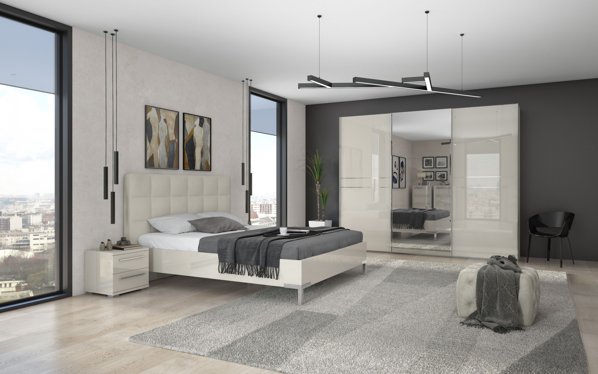 Spalnica Piano je izjemno elegantna spalnica v bež barvi v visokem sijaju, ki bo postavila vaše stanovanje v središče pozornosti. Visoki sijaj bo v vaš dom prinesel več svetlobe in elegance. Spalnica vključuje dve nočni omarici, posteljo dimenzij 160x200 cm in dve nočni omarici. Notranjost garderobne omare vključuje tri palice za obešanje in 9 velikih polic. Ima funkcijo tihega zapiranja ter kromirane ročaje in nogice. Izdelana je iz oplemenitene iverne plošče in eko usnja. Je del kolekcije spalnic Piano, oglejte si še ostale artikle te kolekcije.