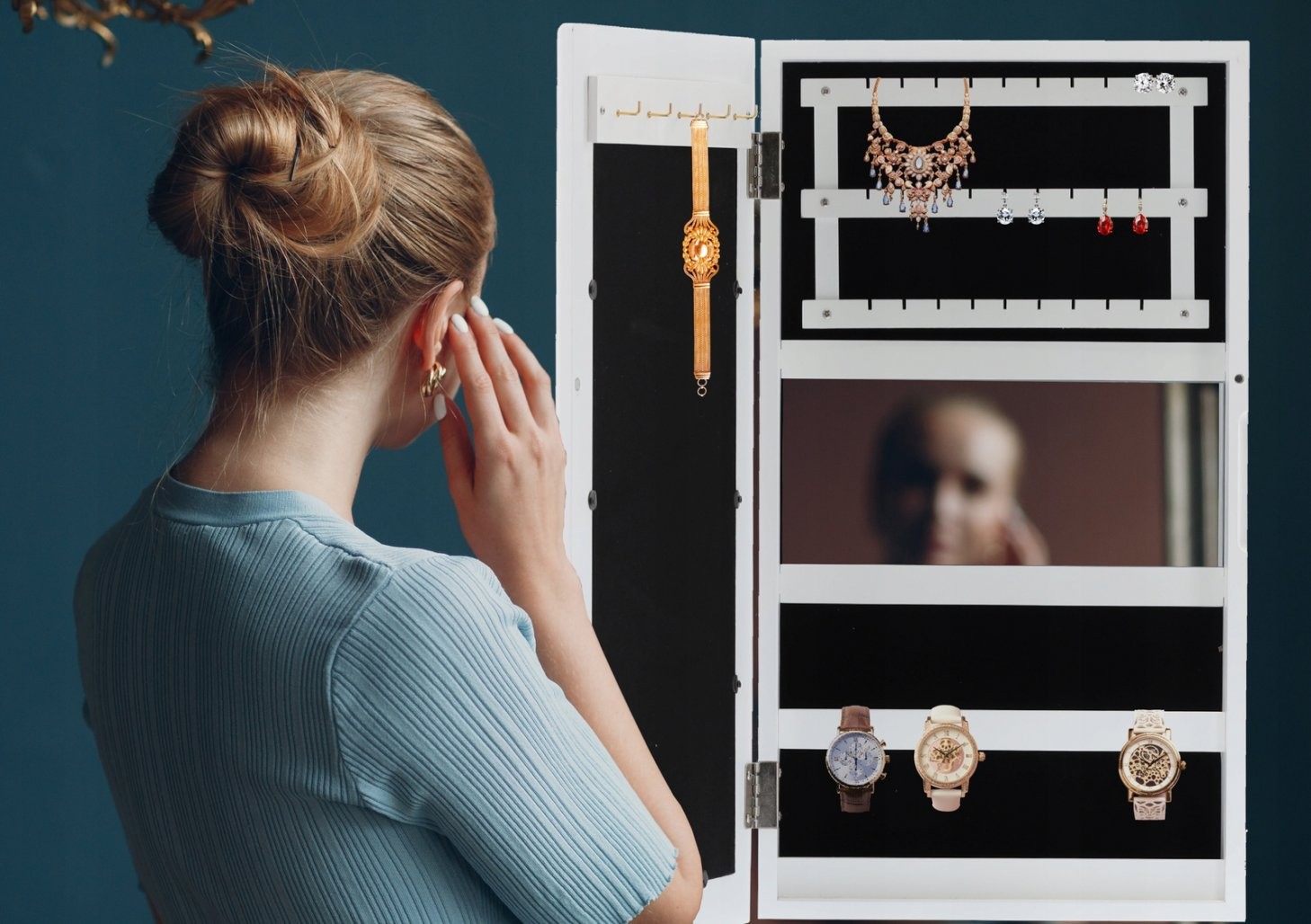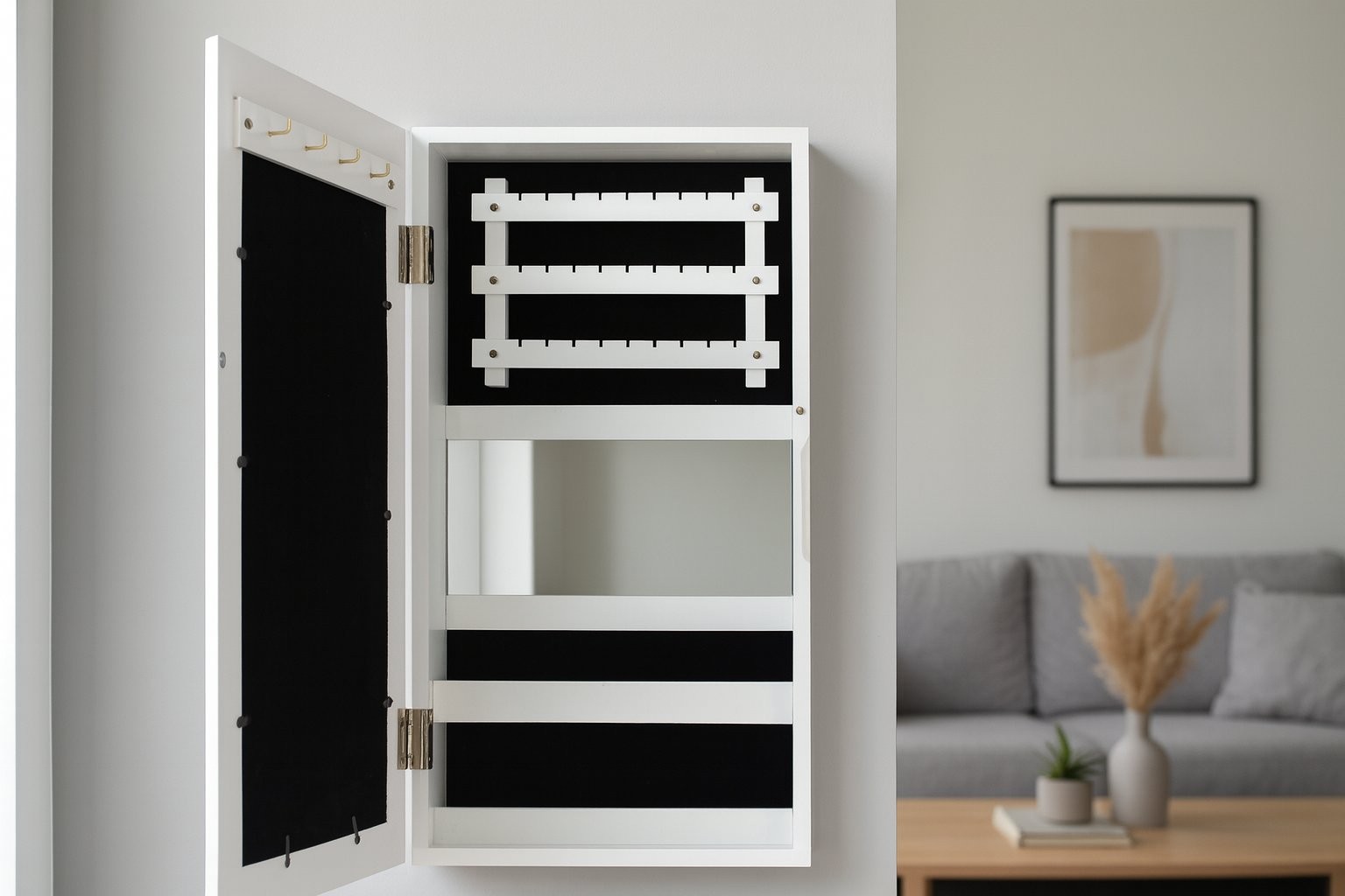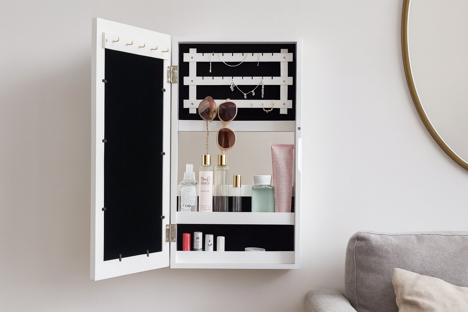 Stenska omarica Pilom za nakit z ogledalom (bela) je kompaktna rešitev za pregledno shranjevanje. Izdelava iz materiala MDF dopolnjuje zasnovo izdelka.