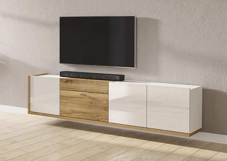 Stenska tv omarica LARS vsebuje kar štiri vratca in predal v katere se lahko shranjujejo knjige, družabne igre in ostali izdelki za katere ne najdete prostora. Tv omarica je na voljo v kombinaciji svetlega hrasta in bele barve visokega sijaja, ki bo osvetlila vaš prostor.