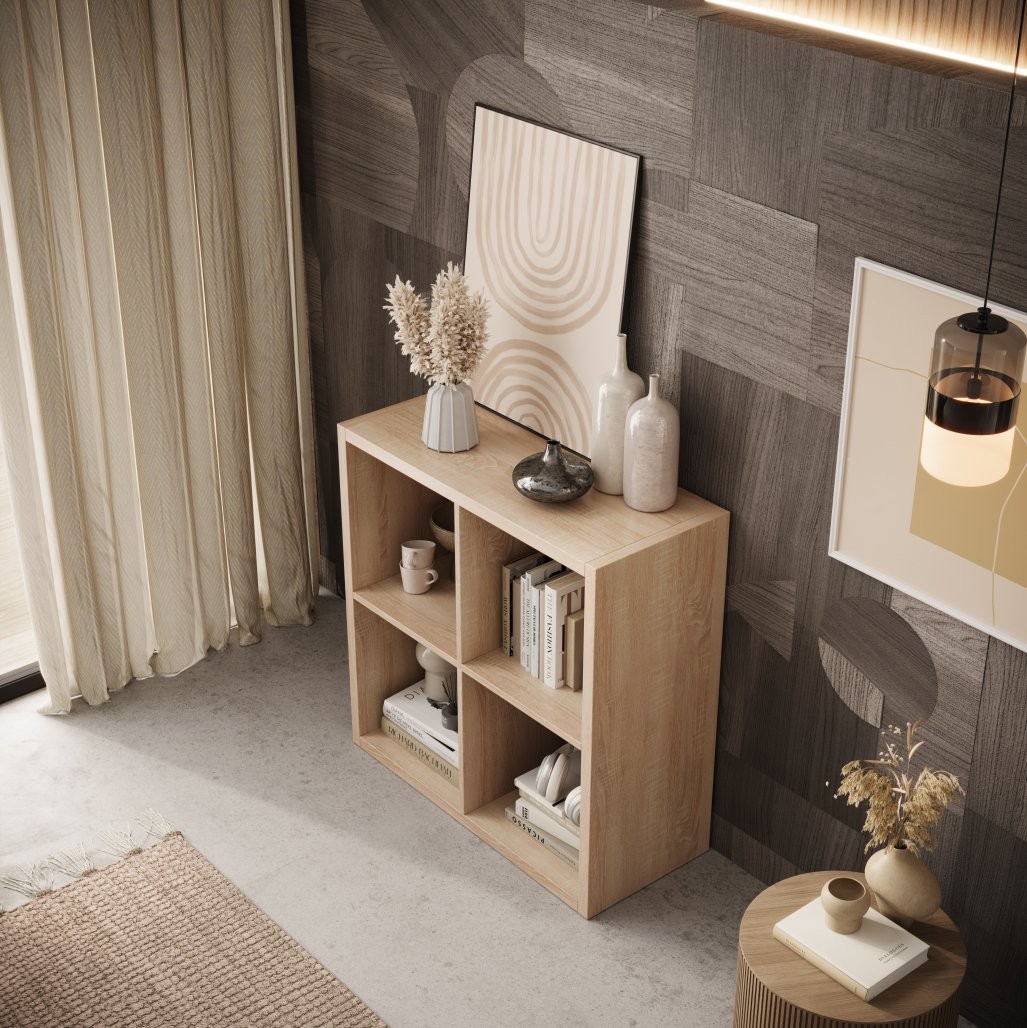 Regal ponuja dovolj prostora za shranjevanje knjig, dokumentov, škatel ali dekorativnih predmetov, hkrati pa s svojo zasnovo prispeva k estetskemu videzu prostora.