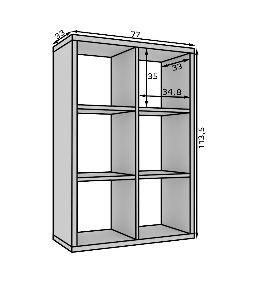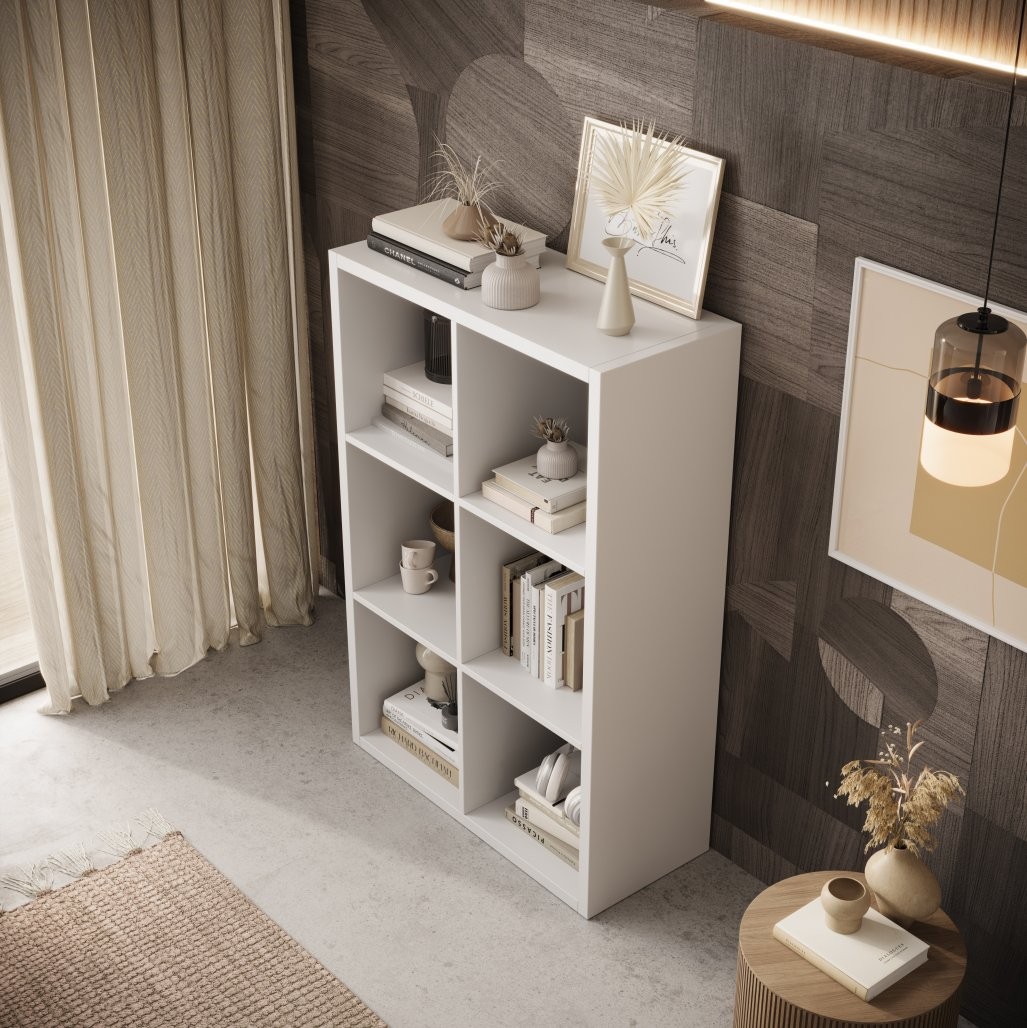Njegova pravokotna oblika in šest prostornh polic omogočata raznoliko uporabo – od shranjevanja knjig, map, dekoracij do dodatkov za dom. Zaradi minimalistične zasnove se odlično poda v različne prostore, kot so dnevna soba, spalnica, otroška soba ali pisarna.