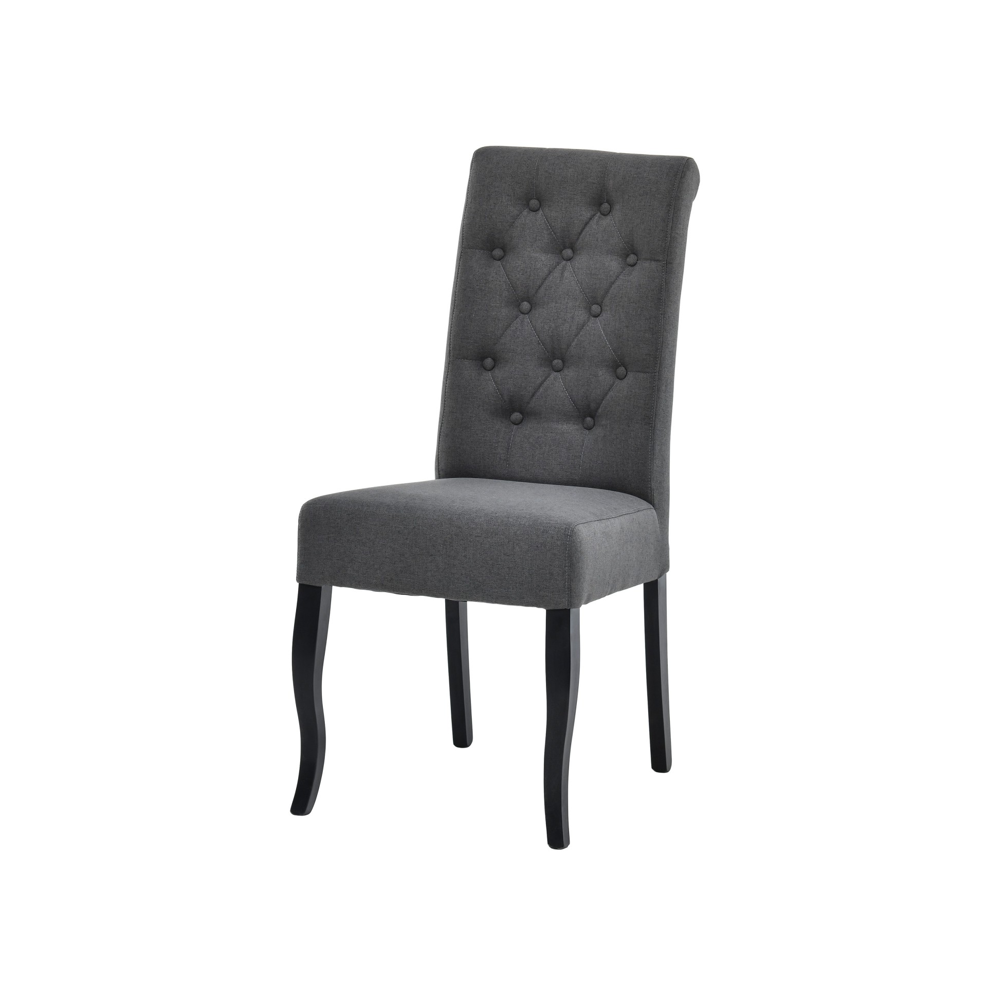 Eleganten in moderen jedilniški stol oblazinjen s kvalitetno tkanino v temno sivi barvi in črnimi nogami iz bukovega lesa. Sedišče je napolnjeno s peno, kar omogoča udobenjše sedenje. Za eleganten videz stola poskrbi visoki naslon, ki ima prešitje v obliki rombov. Maksimalna nosilnost je 120 kg.