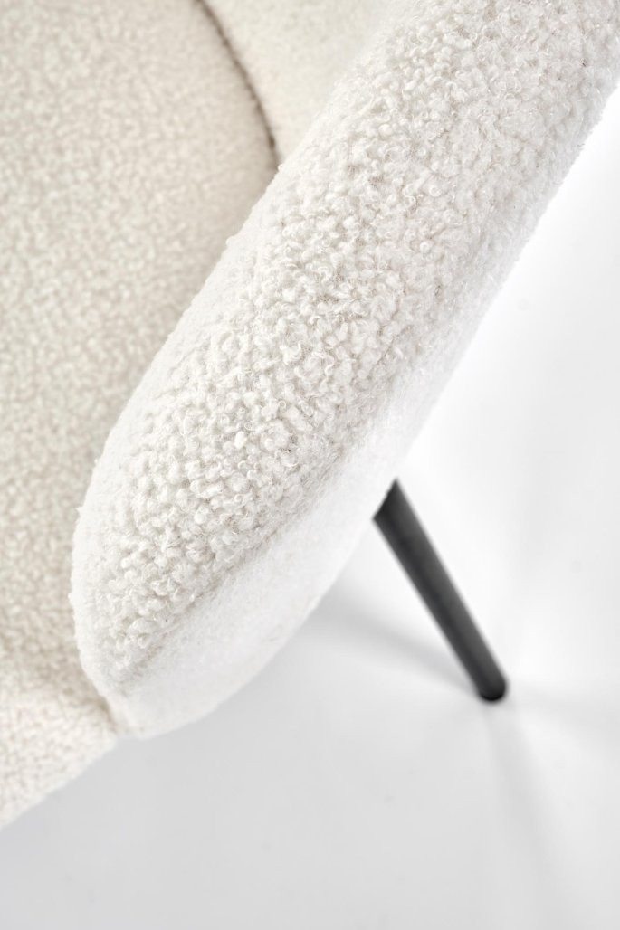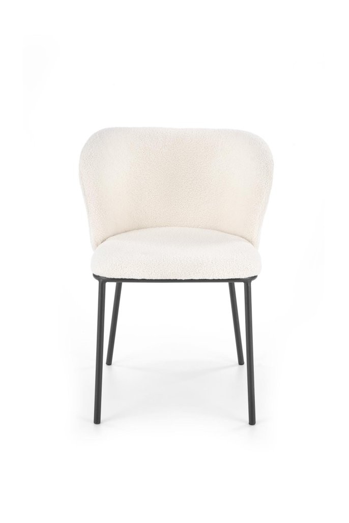 Stol Falin z bouclé tkanino v krem barvi in črnim kovinskim okvirjem ustvarja sodoben, eleganten slog za udobje in stil.
