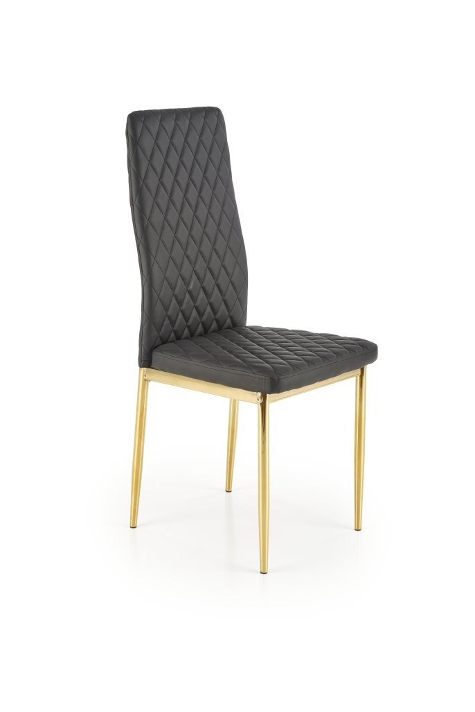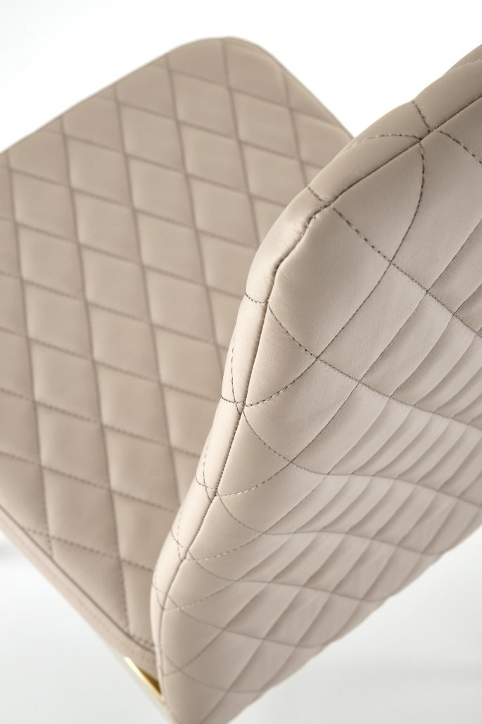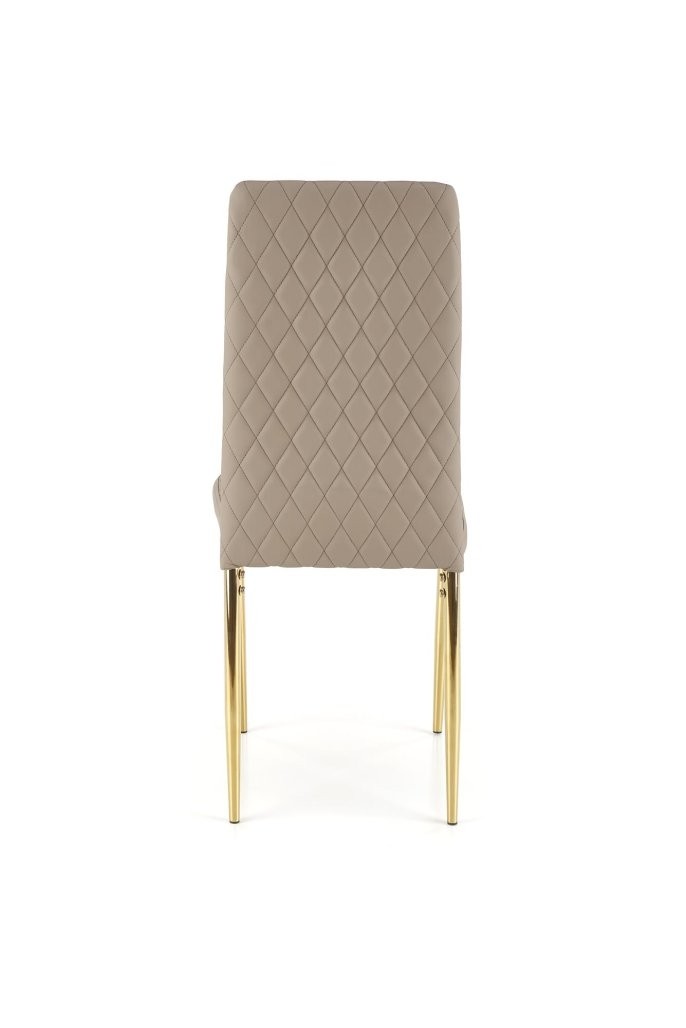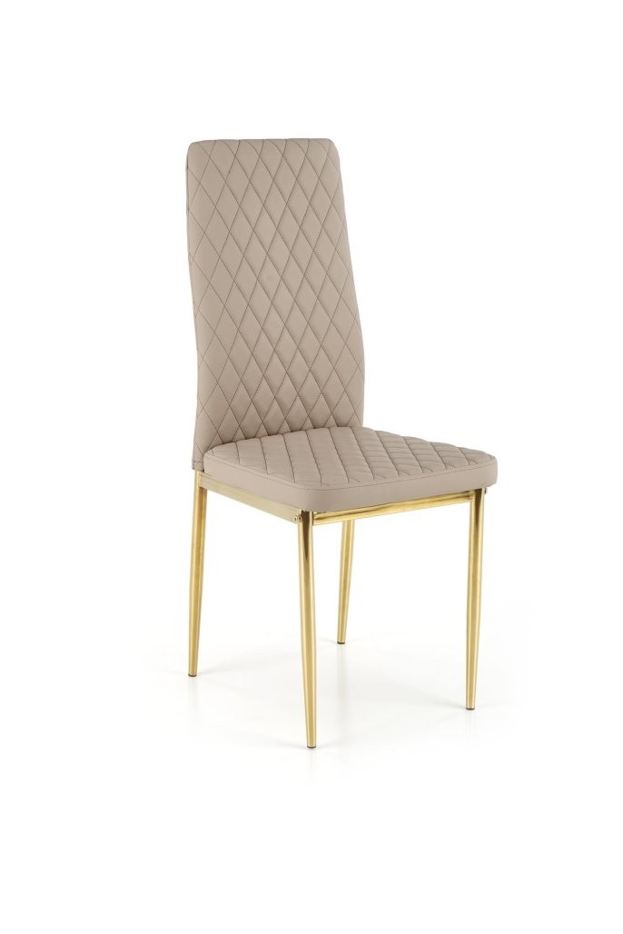 Stol Harin v barvi kapučino in črni, z zlatim kovinskim okvirjem in umetnim usnjem, zagotavlja udobje za vsak prostor.