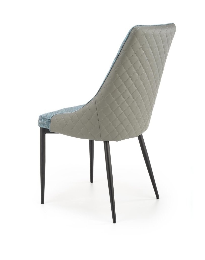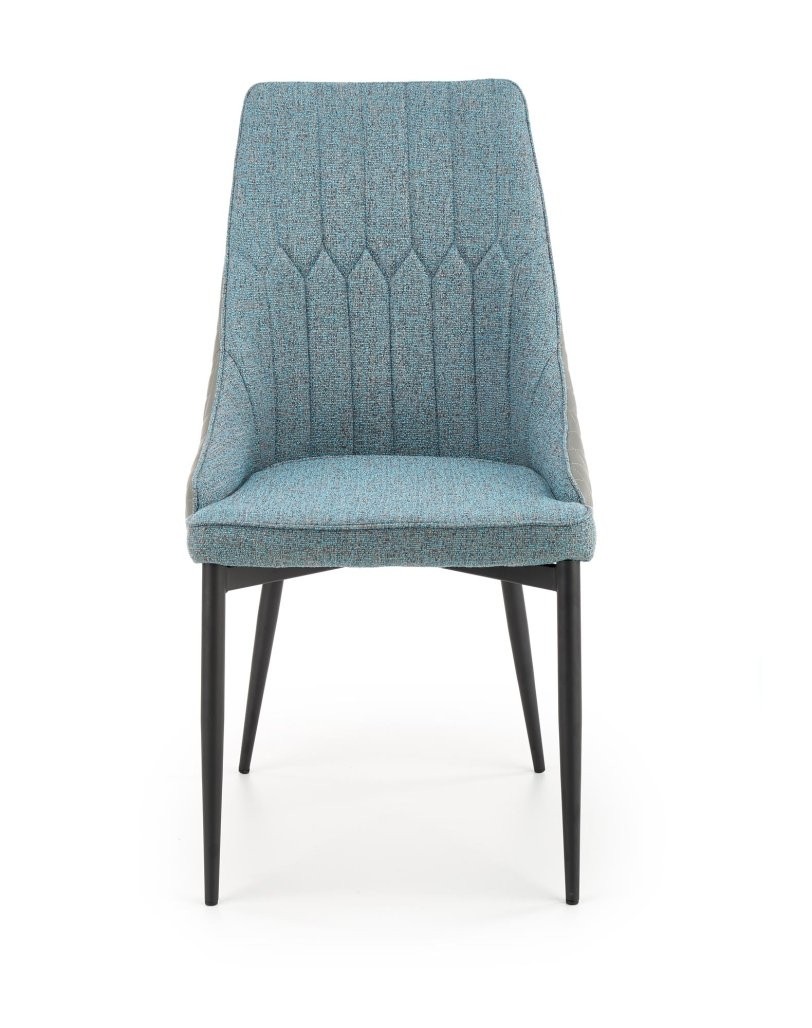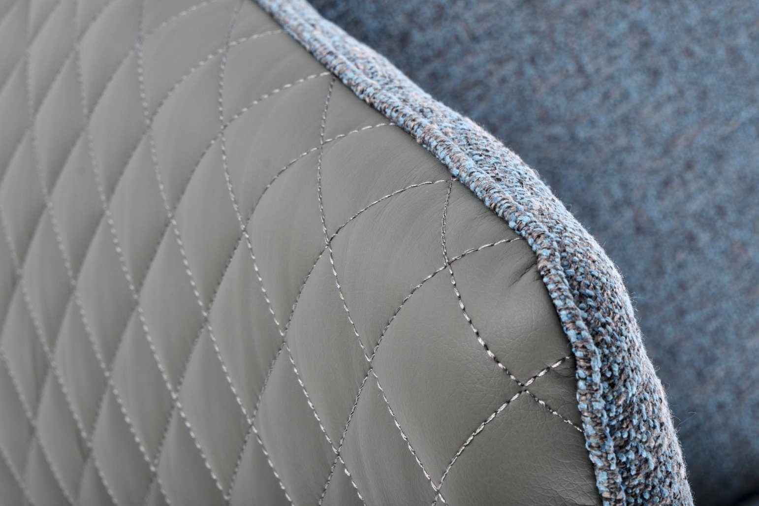 Stol Iros z modernim dizajnom, ki združuje modro tkanino in eko usnje. Kovina v črni barvi doda eleganco, preprostost pa omogoča uporabo v različnih prostorih.