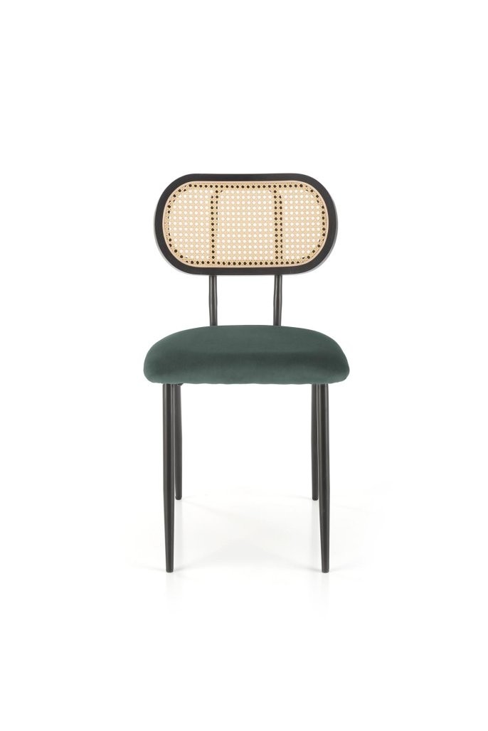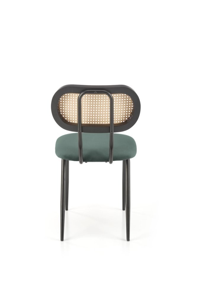 Stol Olenor iz temno zelenega žameta in umetnega ratana na kovinskem okvirju, ki prinaša retro in boho pridih v sodobnem dizajnu.