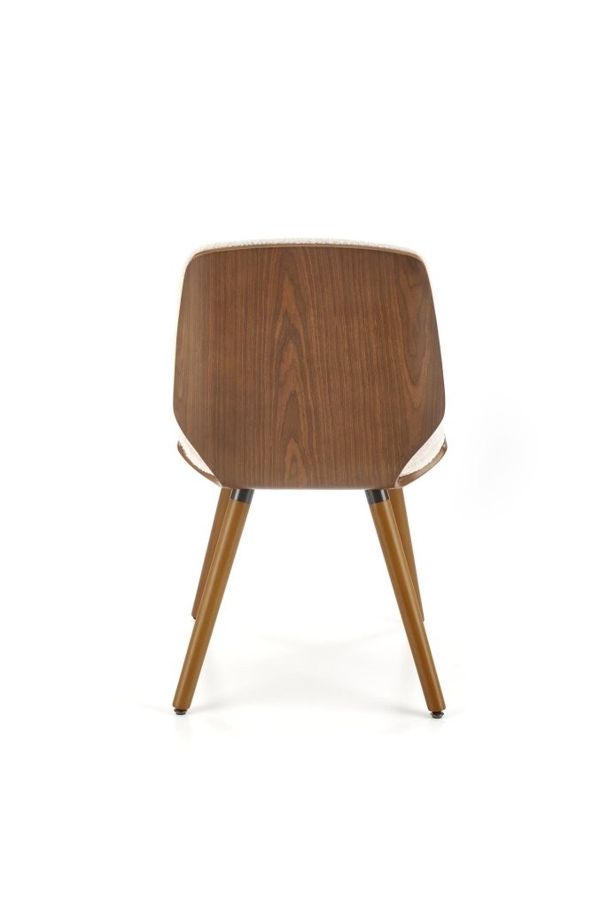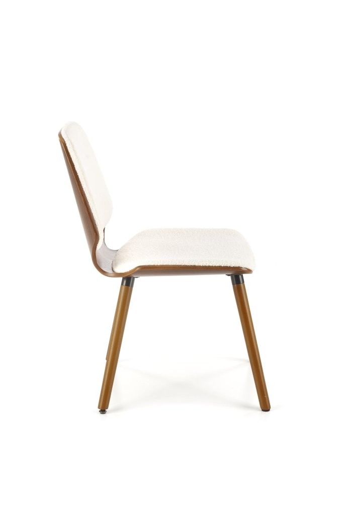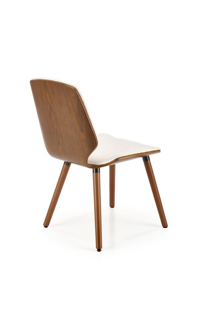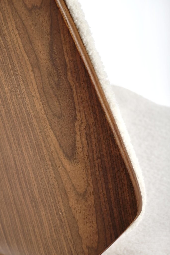 Stol Pelor z bouclé tkanino in masivnim lesom, v kombinaciji kreme in oreha, prinaša mehak dotik in toplino v sodobni prostor.