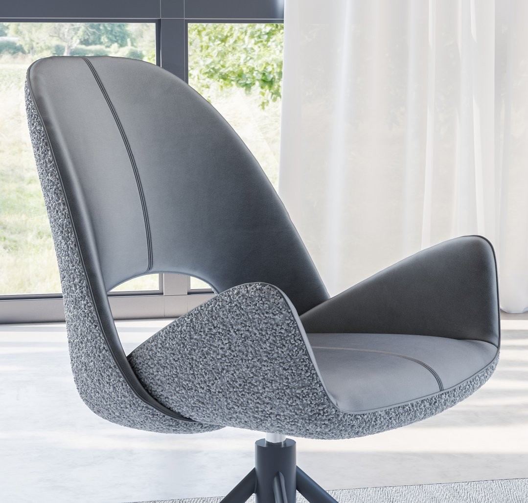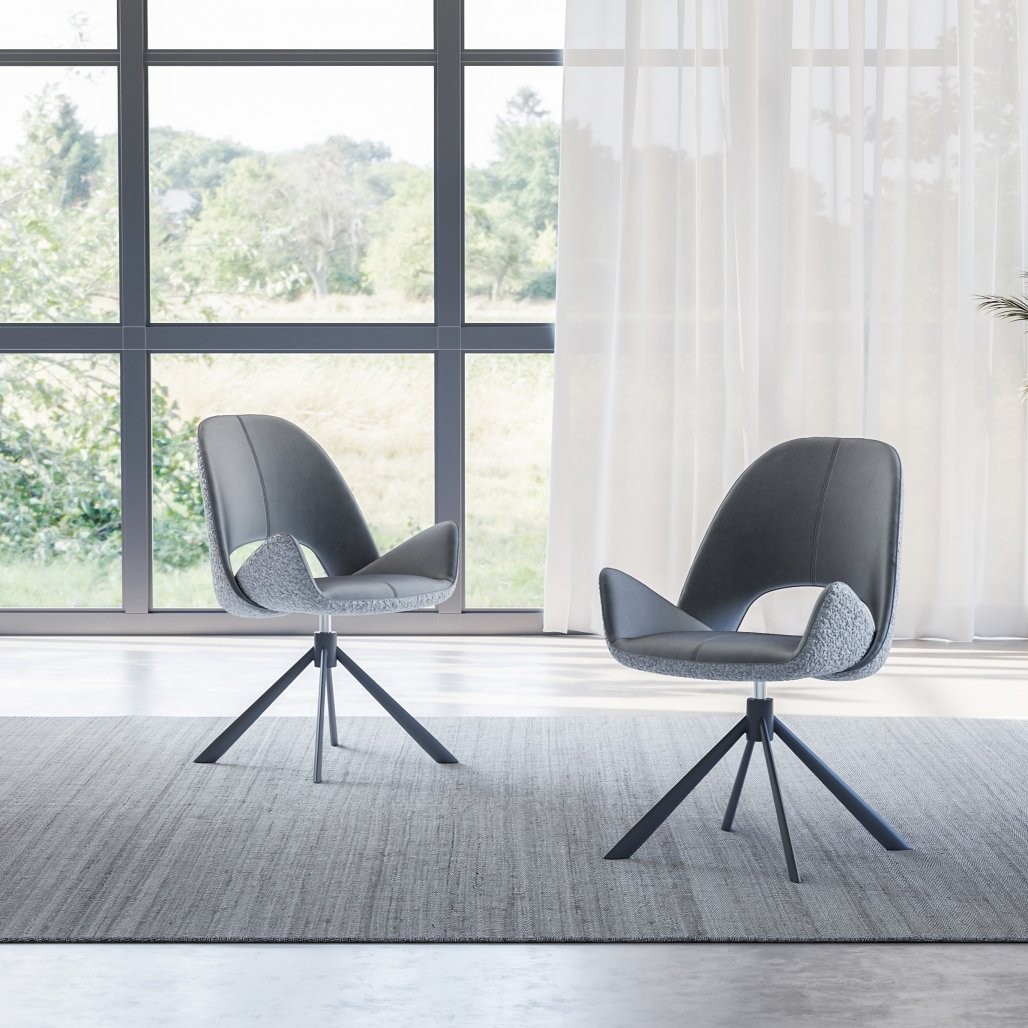 Stol RENE (siva) je udoben jedilniški stol, oblazinjen v mehki sivi tkanini. Z vrtilno ploščo in odprtim hrbtiščem nudi odlično udobje in prosto zračnost.