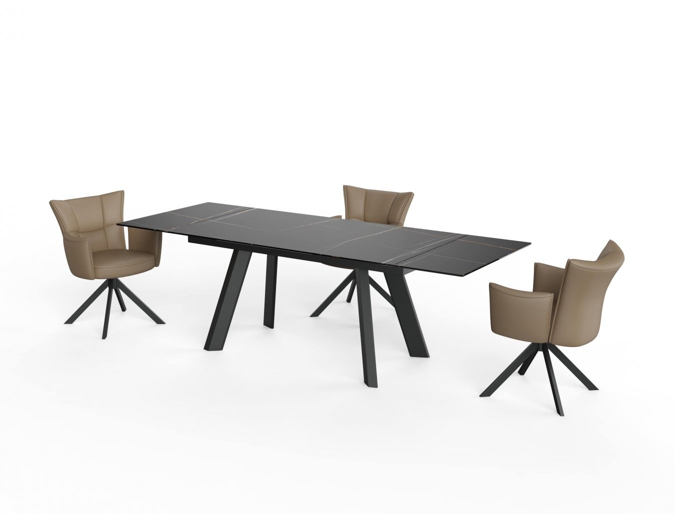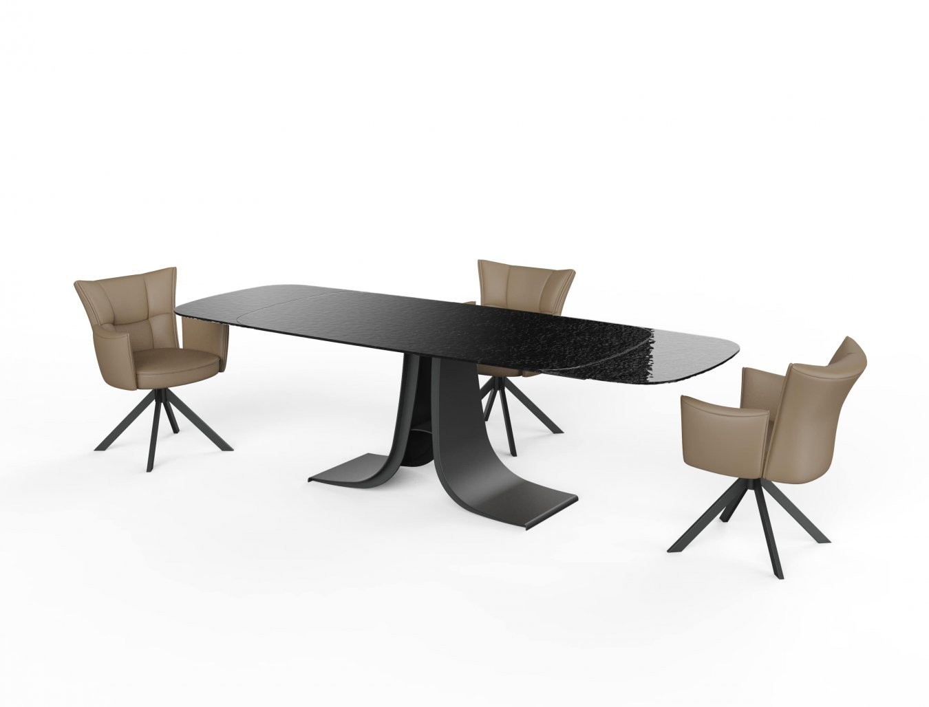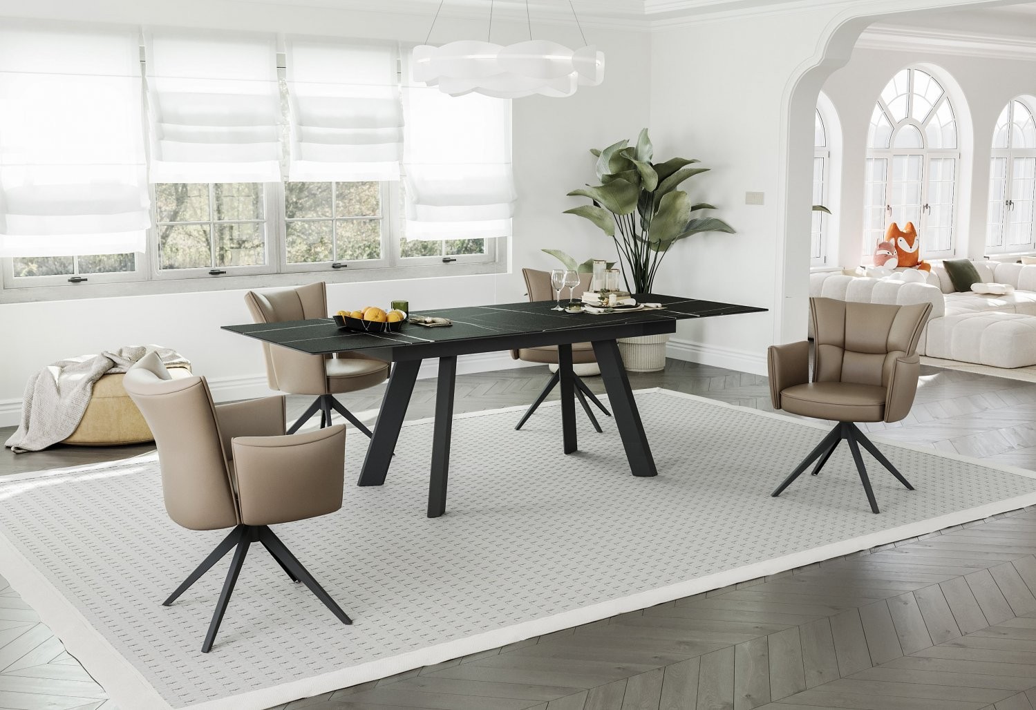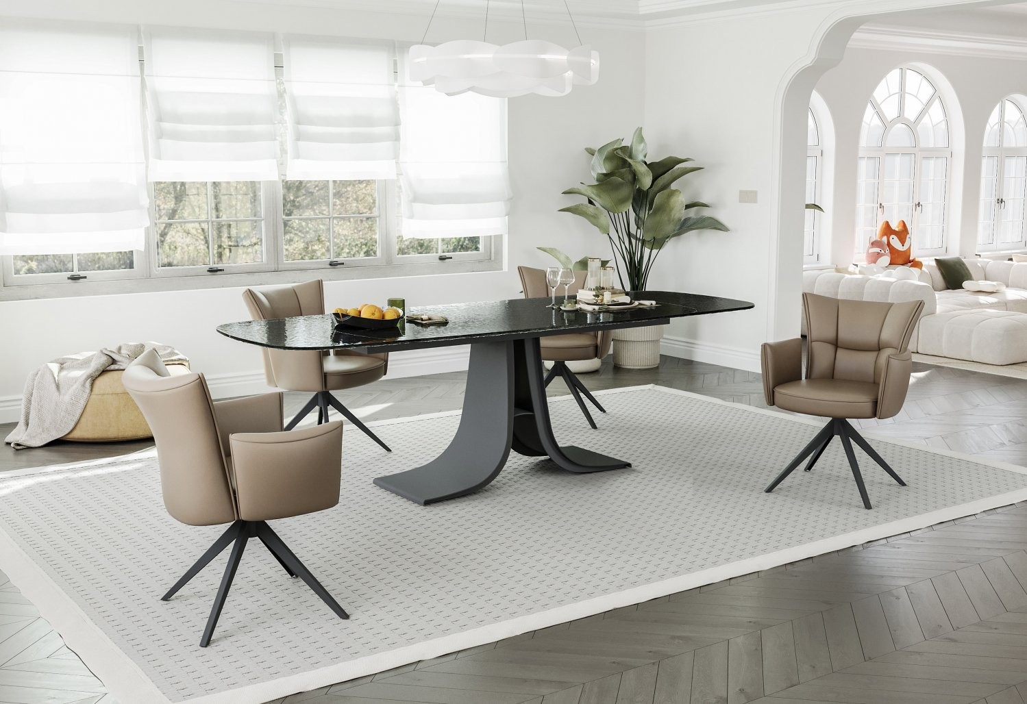 Sodoben jedilniški stol, opremljen z žepkastim vzmetenjem ter vrtljivim podnožjem, ki predstavlja odlično kombinacijo občutka luksuza in udobja s funkcionalnostjo