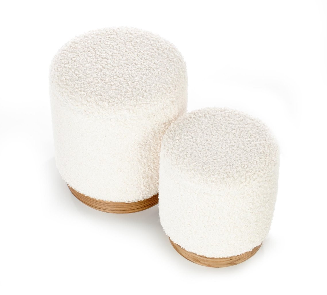 Set taburejev Brinor s kremnim bouclé oblazinjenjem in naravnim furnirjem, ki vključuje funkcijo shranjevanja. Kompaktna zasnova je idealna za urejanje manjših prostorov.