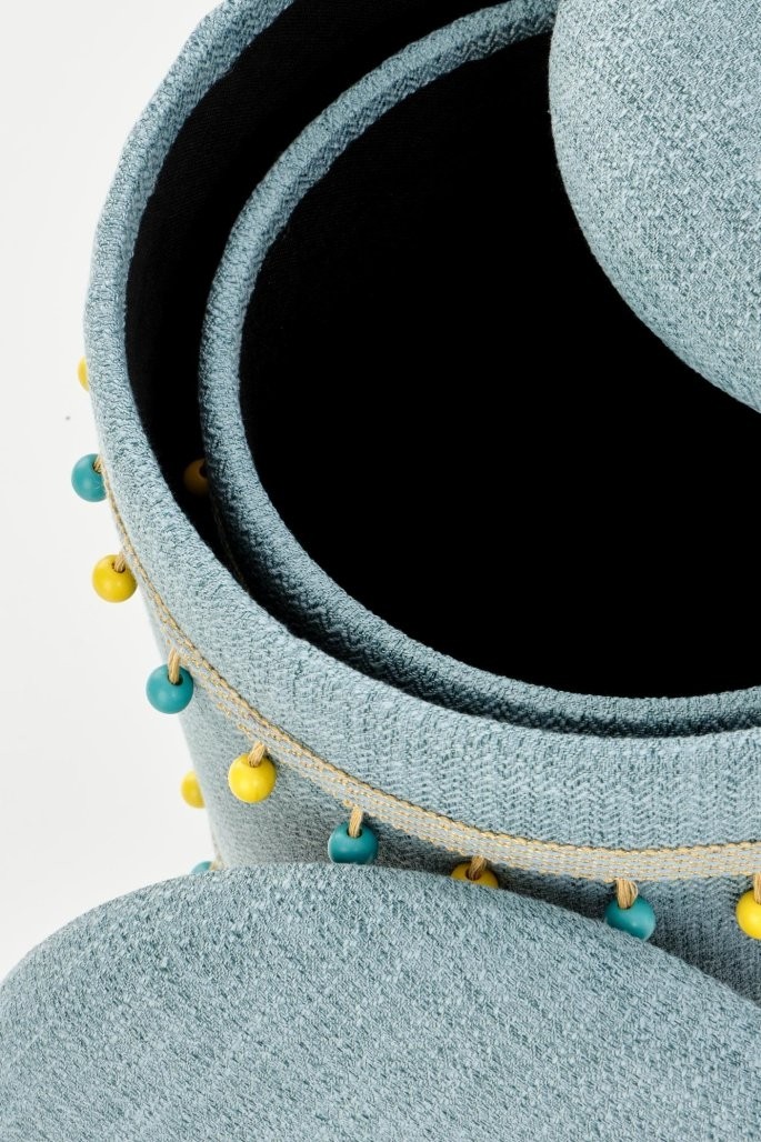 Tabure Inron v boho slogu, na voljo v modri in rumeni barvi, prinaša priročno rešitev za shranjevanje. Set dveh taburejev različnih velikosti združuje praktičnost in barvito estetiko, primeren za dodatek k sodobnim in klasičnim interierjem.