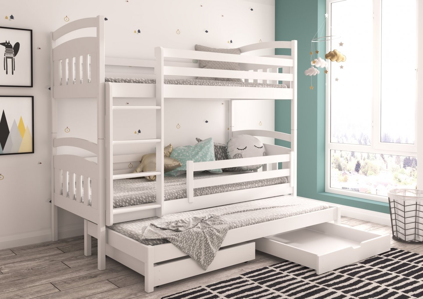 Troslojna otroška postelja ALDO 180x80 je popolna rešitev za varčevanje prostora v manjših otroških sobah. S svojo funkcionalnostjo in sodobnim dizajnom omogoča udoben in varen spanec kar trem otrokom.