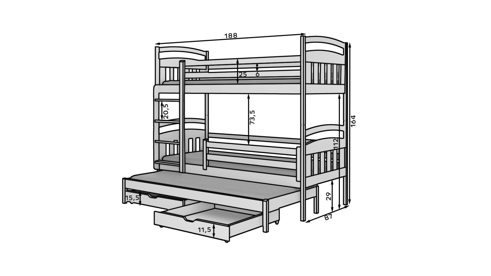 - Ležišča: zgornje 180x80 cm, spodnje 180x80 cm, izvlečno 170x80cm