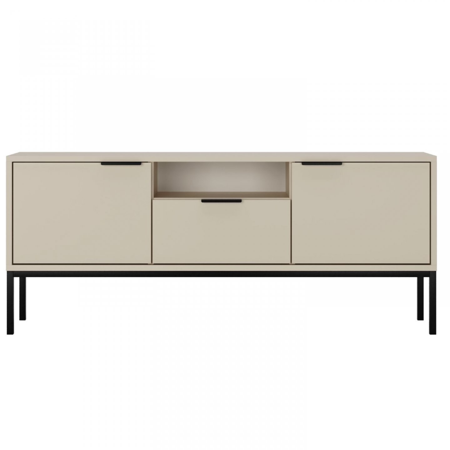 V osrednjem delu ima izvlečni predal in odprto nišo za medijske naprave, na straneh pa dva zaprta prostora za dodatno shranjevanje. Konstrukcijo dopolnjujejo aluminijasti ročaji in podnožje iz prašno barvanega jekla, kar poudari sodoben značaj omarice. Predal ima polni izvlek na sinhronih vodilih, vrata pa tečaje s tihim zapiranjem in odpiranjem do 110 stopinj. Model je na voljo v več barvah in je namenjen samostojni montaži.