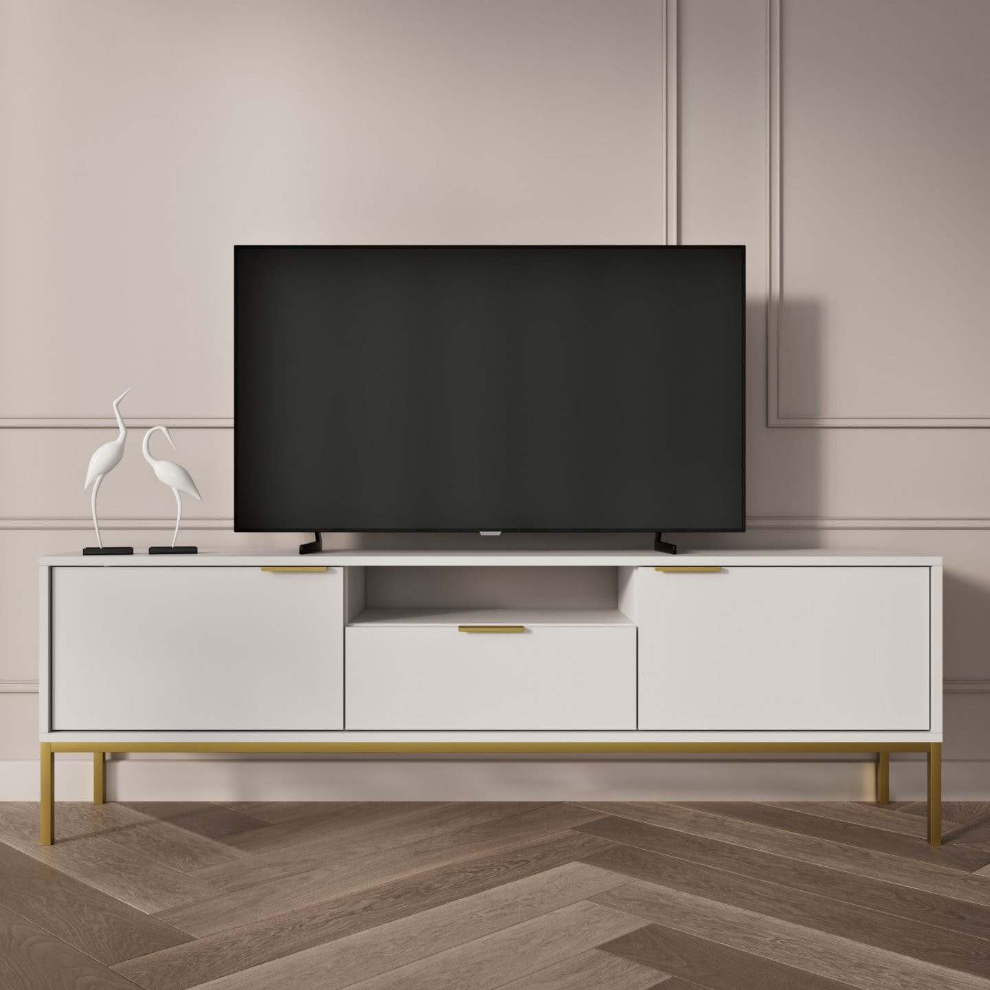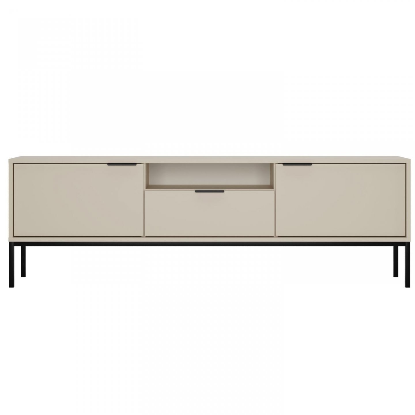 V osrednjem delu ima izvlečni predal in odprto nišo za medijske naprave, na straneh pa dva zaprta prostora za dodatno shranjevanje. Konstrukcijo dopolnjujejo aluminijasti ročaji in podnožje iz prašno barvanega jekla, kar poudari sodoben značaj omarice. Predal ima polni izvlek na sinhronih vodilih, vrata pa tečaje s tihim zapiranjem in odpiranjem do 110 stopinj. Model je na voljo v več barvah in je namenjen samostojni montaži.