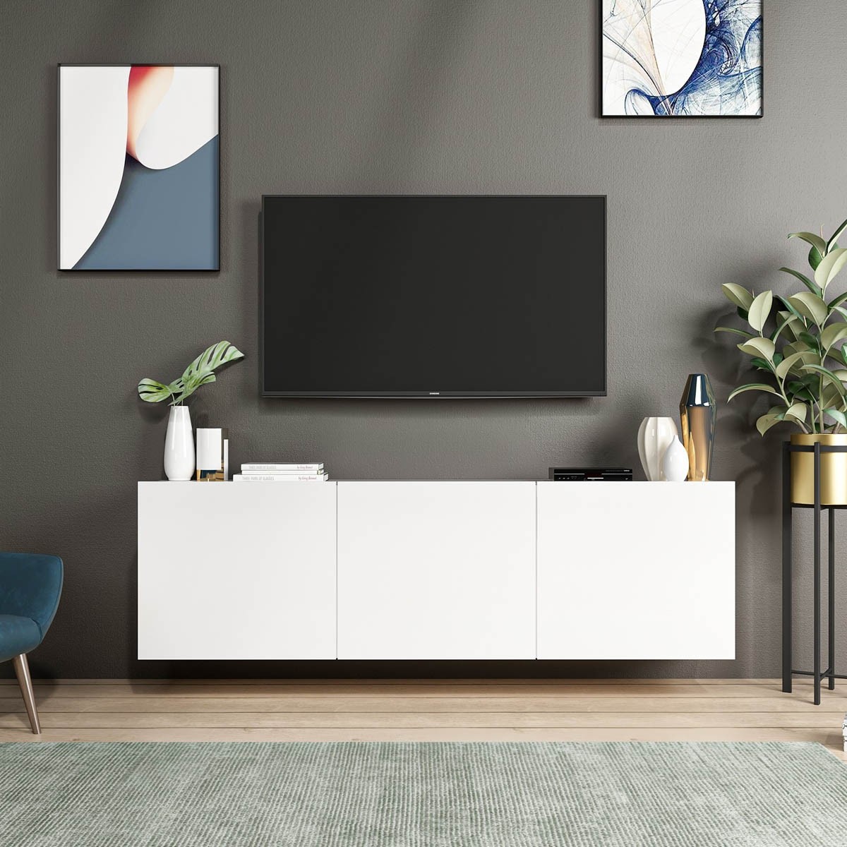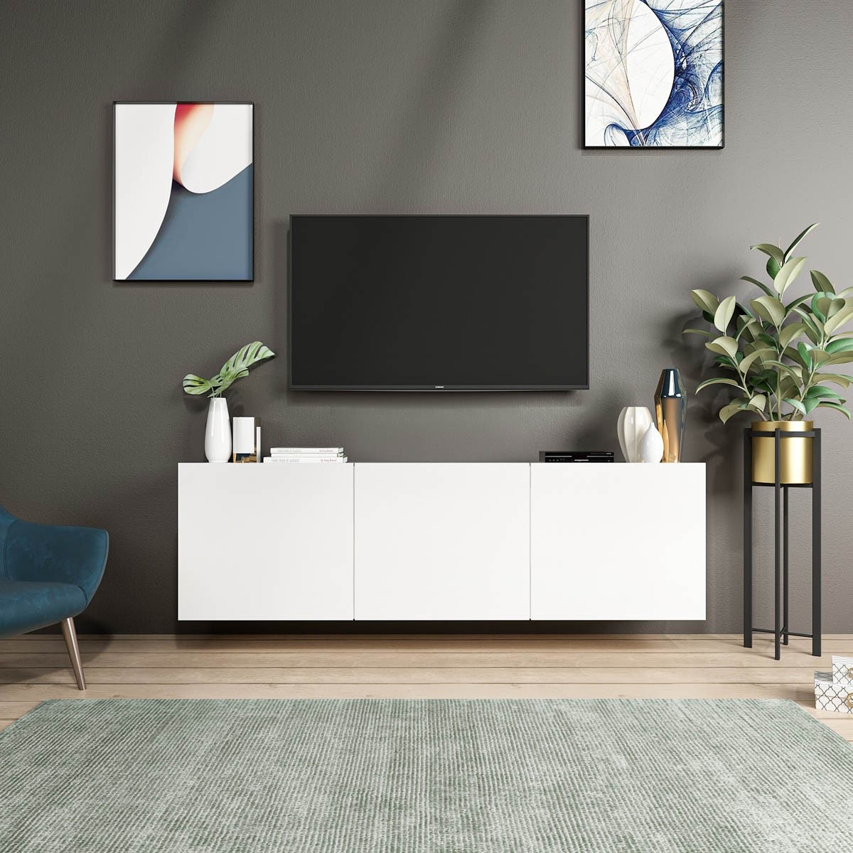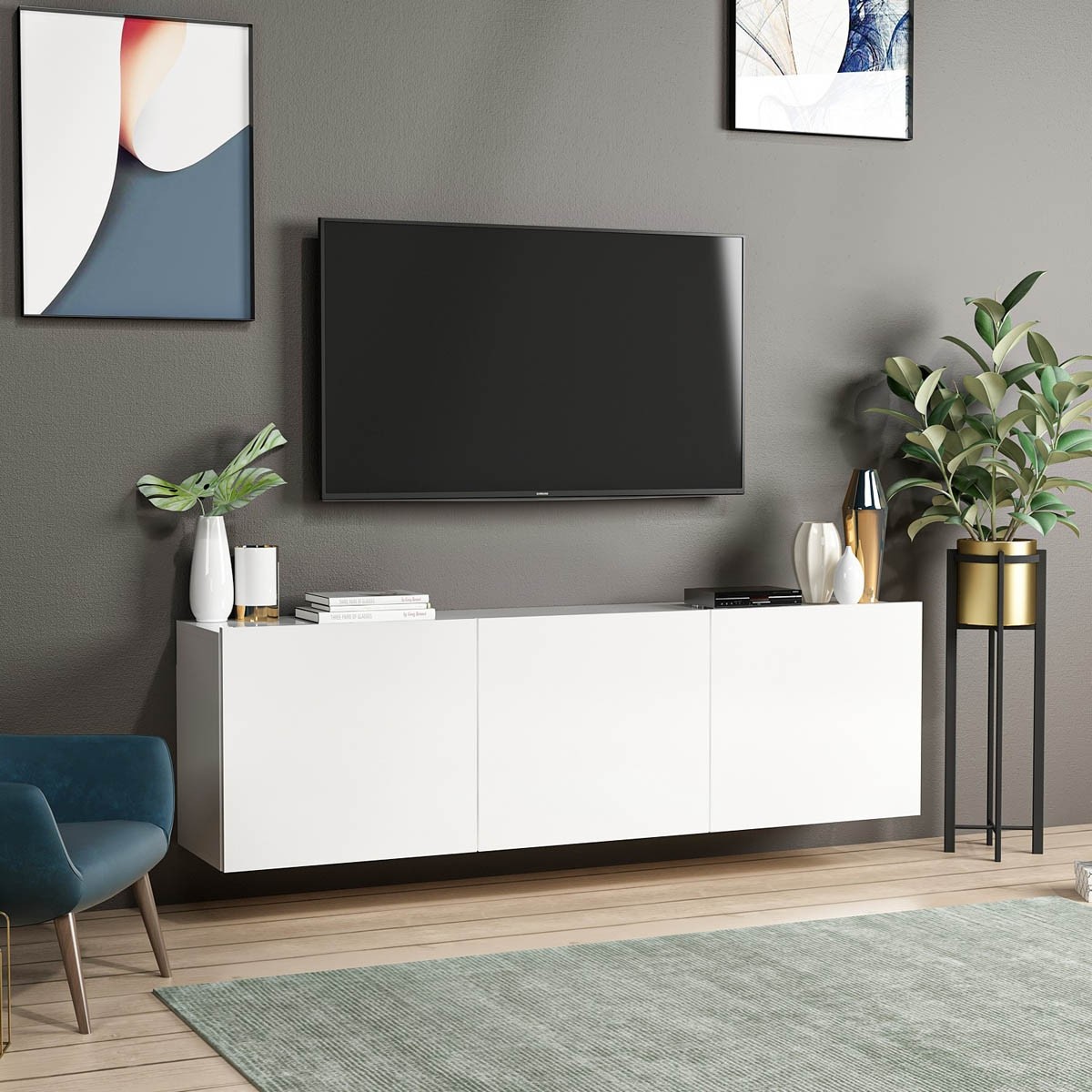 Tv omarica COMORAT je preprosta in elegantna. Bela barva ji daje svež in svetel videz, zaradi česar se lepo prilega v skoraj vsak interier. Poleg tega pa je tv omarica izdelana tako, da se jo lahko enostavno pritrdi na steno, kar omogoča enostavnejše sesanje pod njo, brez potrebe po prestavljanju težkih pohištvenih kosov. Omarica ima tri vrata, ki omogočajo praktično shranjevanje različnih predmetov.