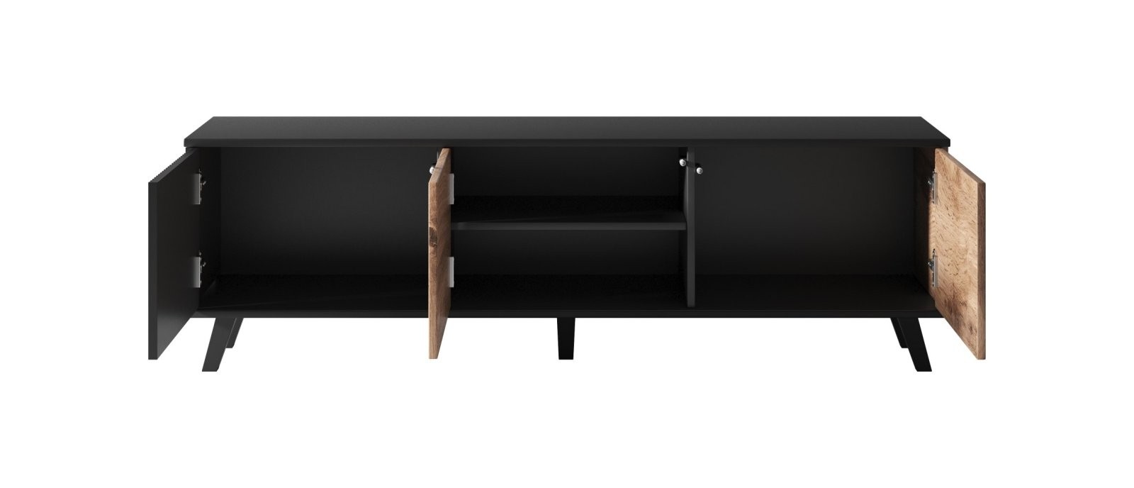 TV omarica Delmar s širino 150 cm v sodobnem dizajnu združuje hrastov videz in črno barvo, kar ustvarja eleganten prostor za vašo avdio-vizualno opremo. Omara je stabilna in primerna za sodobne interierje.