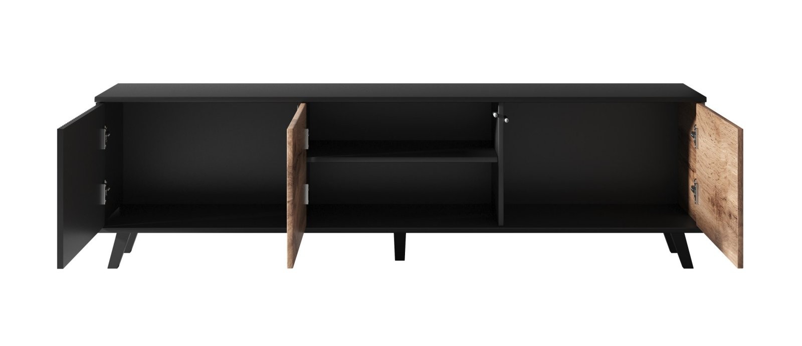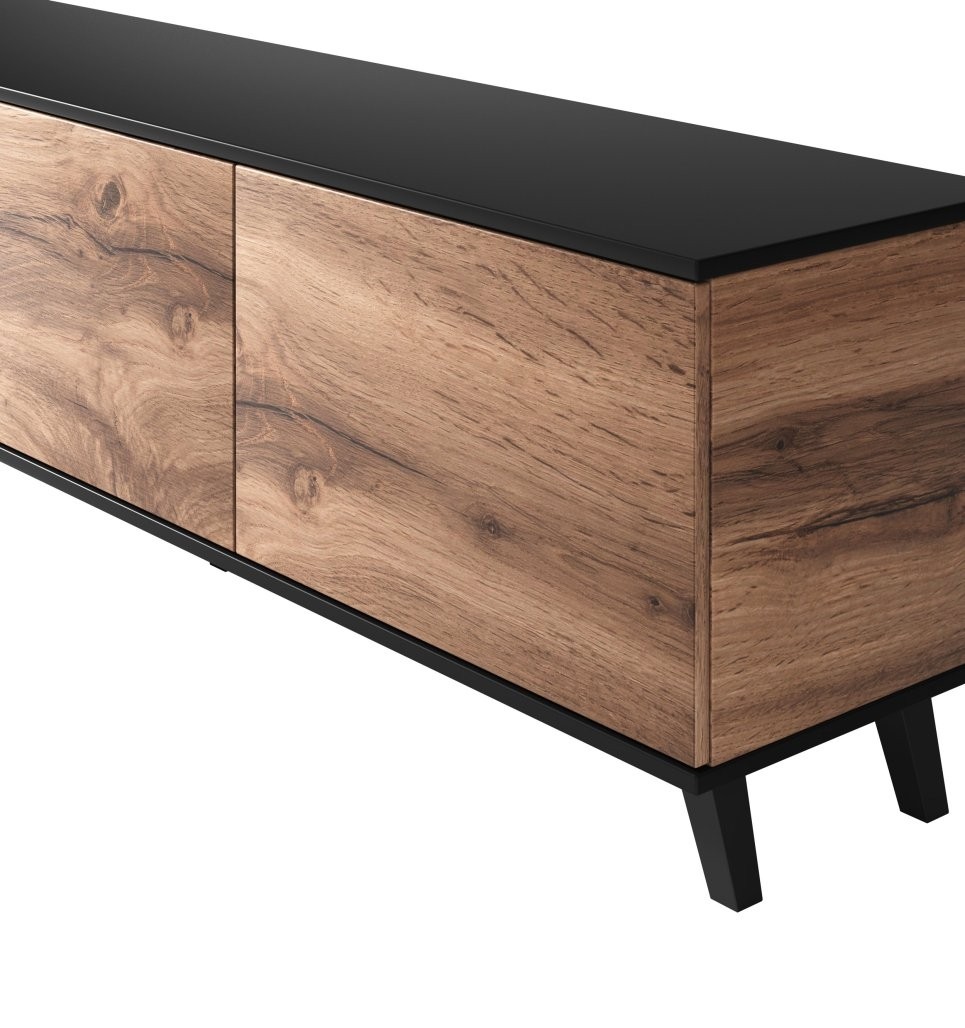 TV omarica Delmar širine 180 cm z votan hrastovim vzorcem in črnimi elementi nudi dovolj prostora za večje zaslone. Prilega se sodobnim interierjem, njen dizajn pa dopolnjuje minimalističen videz prostora.