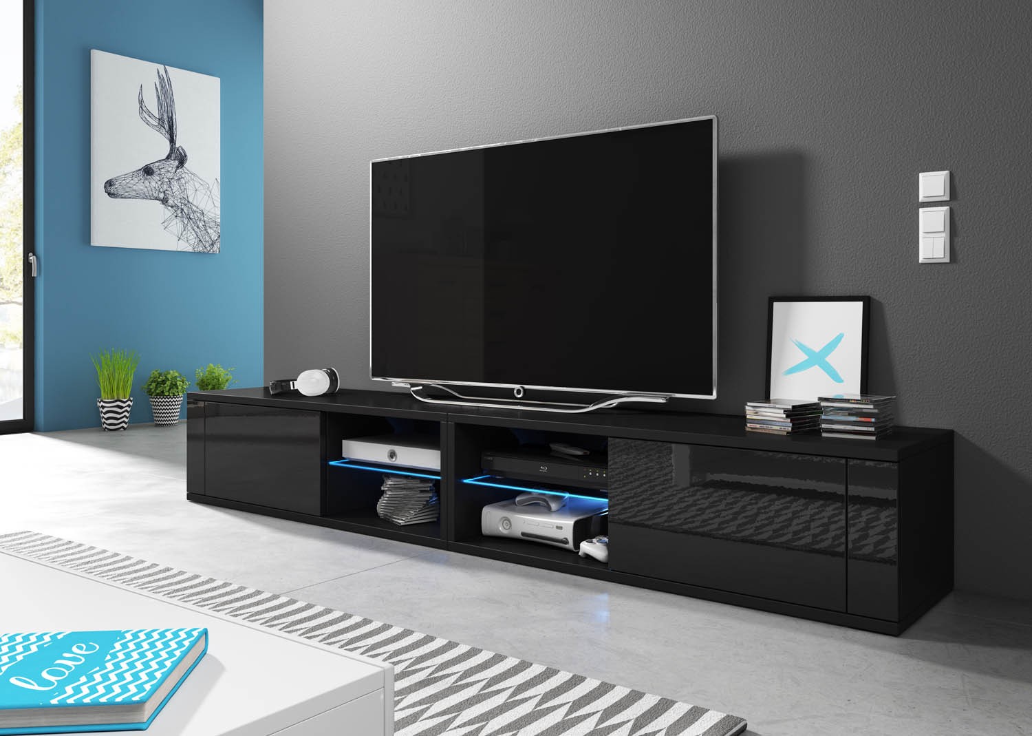 Je prišel čas za novo pohištvo? S TV omarica ELSA 2 črna visoki sijaj/mat črna 200 cm + LED bo vaš dom z lahkoto postal bolj udoben in stilsko dovršen. Dekorirajte svojo dnevno sobo s TV regalom, s katerim bo vaš dom izgledal večji in lepo pospravljen. Vam vaš dom ne nudi veliko prostora? Potem morate biti še posebej pozorni pri izbiri vašega pohištva.Če v vašem domu ni veliko prostora je določitev postavitve precej težavna. Zato je ta TV regal zasovan z namenom, da naredi vaš dom bolj prostoren in posledično tudi bolj udoben.