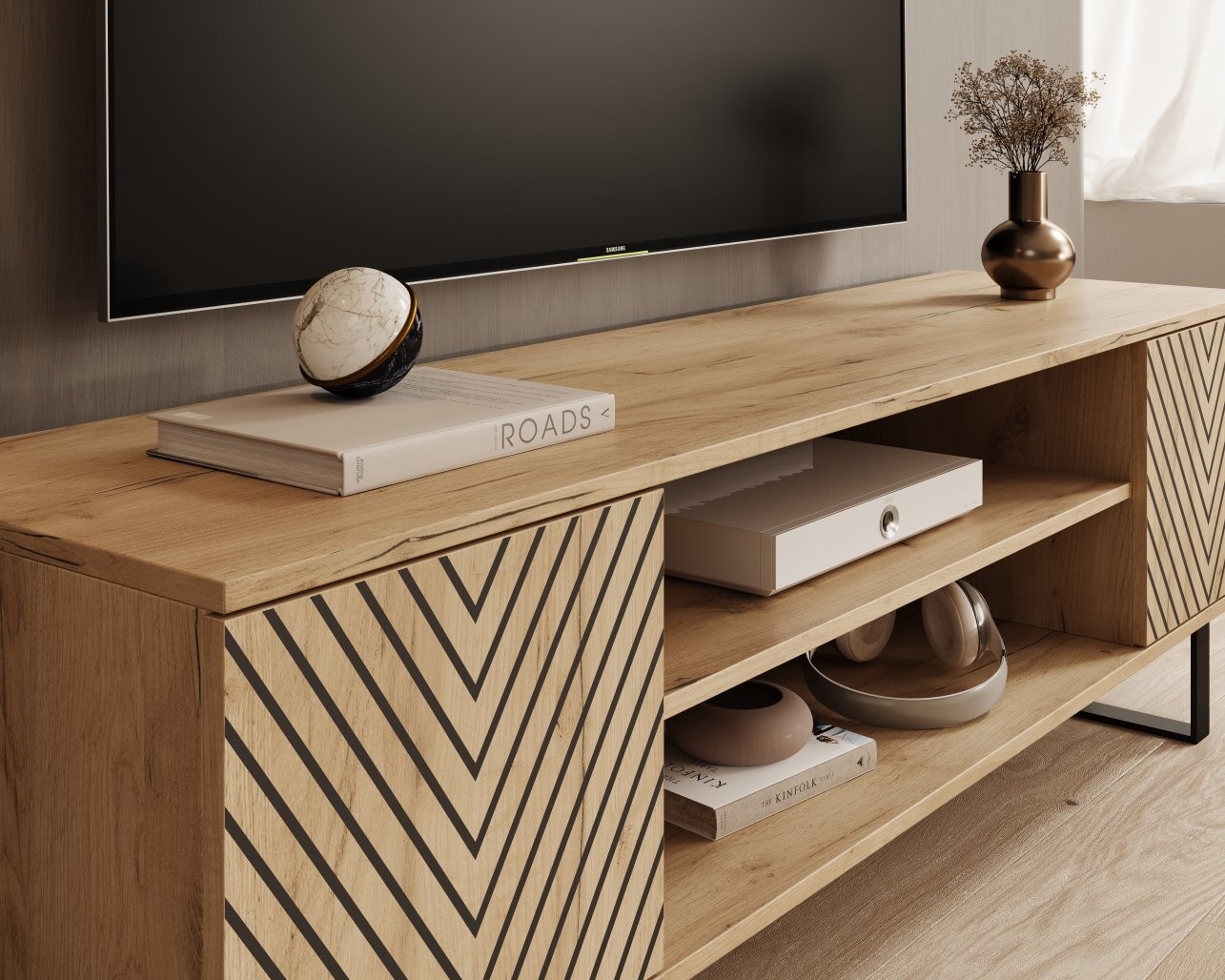 TV omarica Lorello 155 cm je popolna izbira za vse, ki iščejo elegantno in funkcionalno rešitev za svoj dnevni prostor. Združuje skandinavski in industrijski dizajn ter prinaša edinstven slog s subtilnimi motivi lamel in ribje kosti.