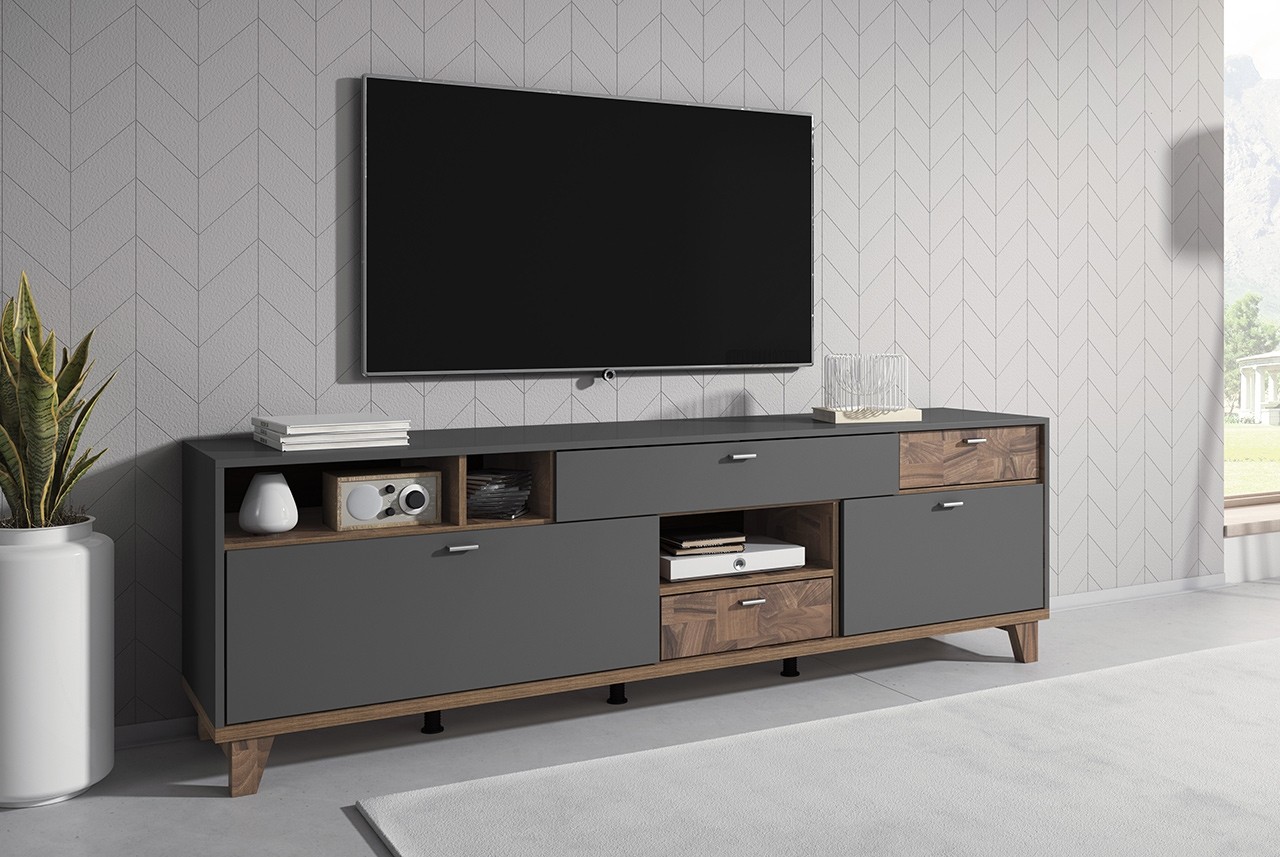 Izjemno funkcionalna TV omarica OSLO ima obilo manjših omaric, predalov in odprtih polic, ki vam omogočajo odlično organizacijo vaših DVDjev, revij, družabnih iger in ostalih podobnih predmetov. Vaša dnevna soba bo z njo videti bolj moderna in vedno lepo pospravljena!