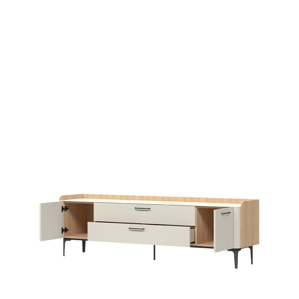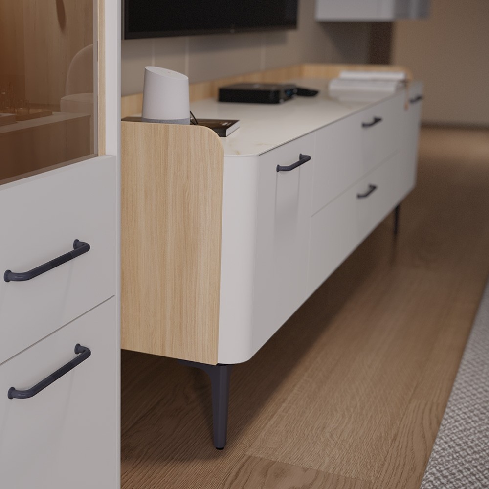 TV OMARICA RADDA AIR v vašo dnevno sobo vnaša lahkotnost in harmonijo. Kombinacija svetlih barv ustvarja prijeten ter vizualno zračen prostor, visoke nogice omogočajo enostavnejše čiščenje, mehko zapiranje pa lahkotnejšo vsakodnevno uporabo. Steklena površina dodaja pridih razkošja, medtem ko antracitni ročaji in nogice zagotavljajo sodoben in prefinjen videz.