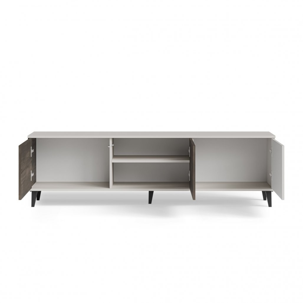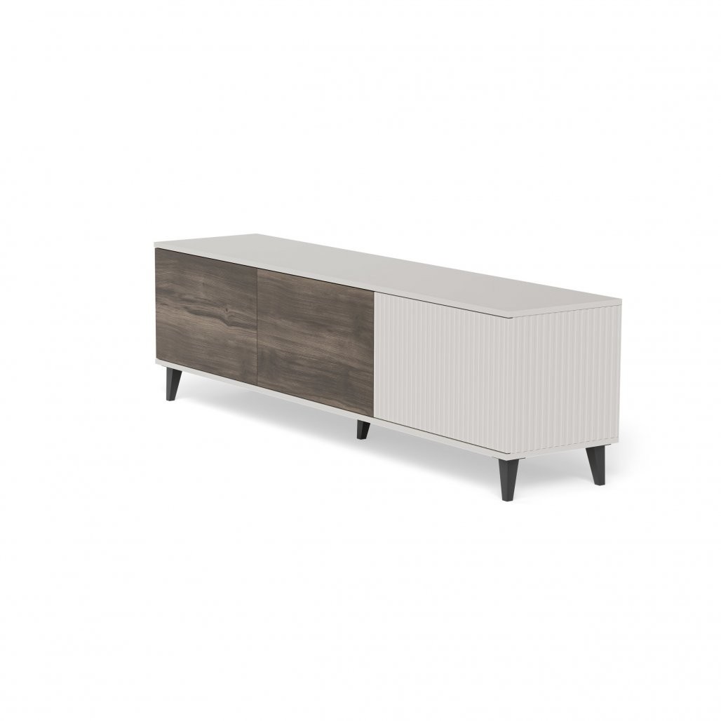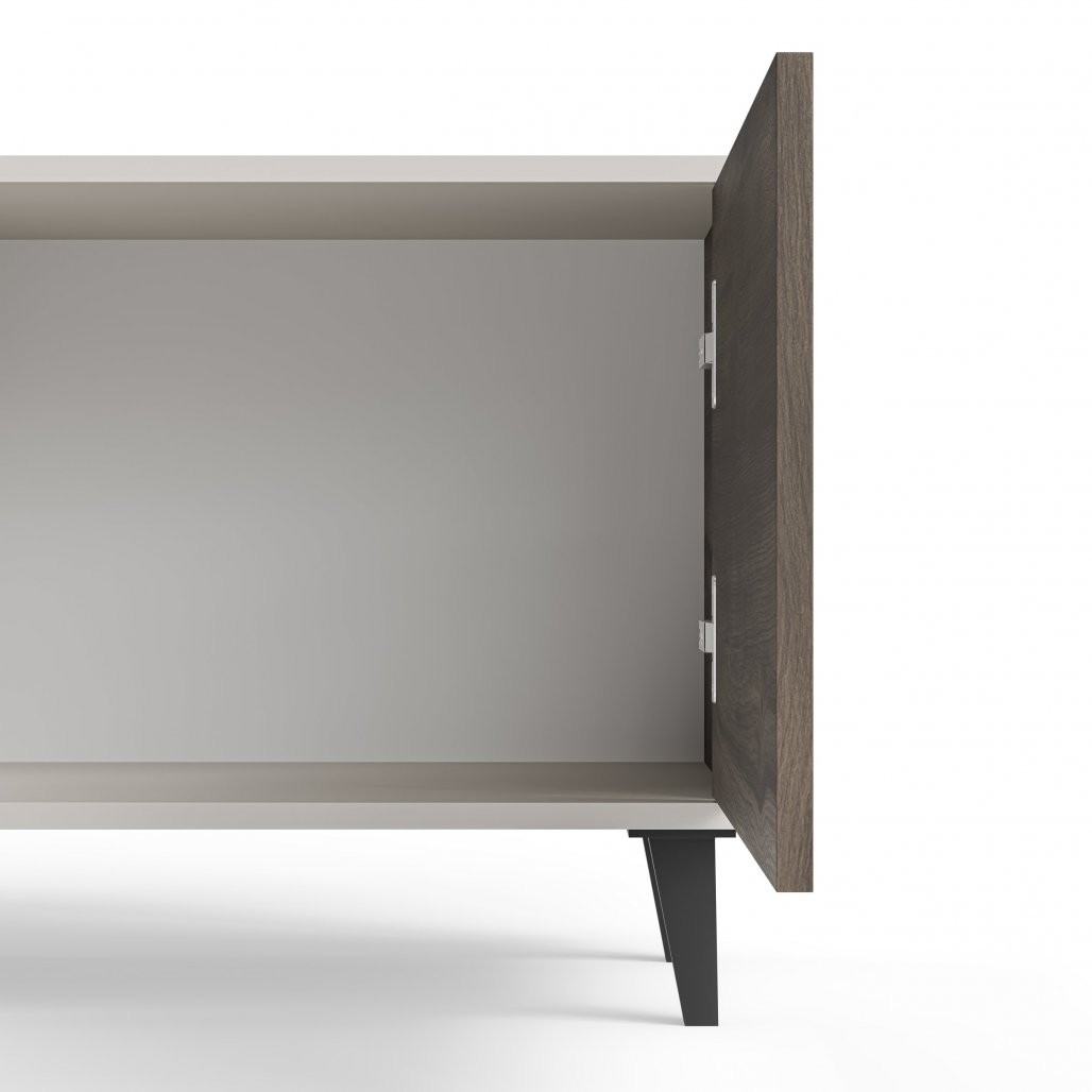 TV omarica je izdelana iz visokokakovostnih in trpežnih materialov, kot so laminiran MDF, laminirana iverna plošča in polipropilen, kar zagotavlja dolgo življenjsko dobo in odpornost na vsakodnevno obrabo. S svojo kombinacijo barv kašmir, oreh in črna se zlahka vključi v različne notranje stile in doda toplino vašemu bivalnemu prostoru.