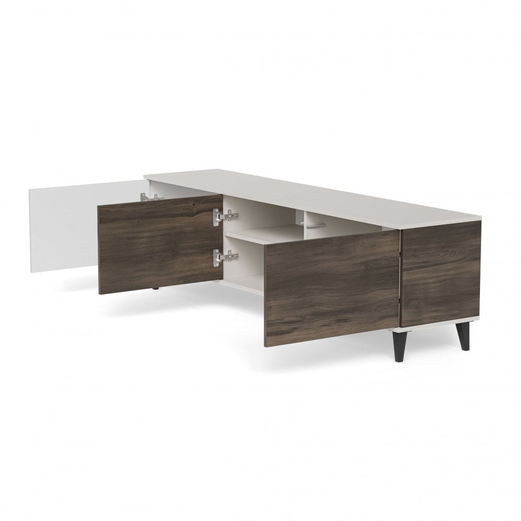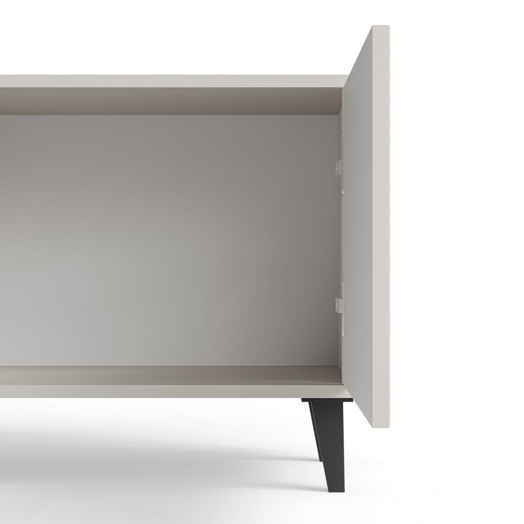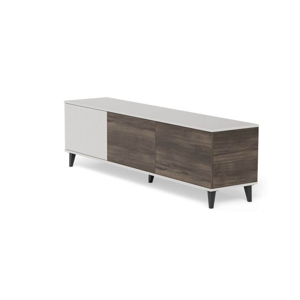 TV omarica je izdelana iz visokokakovostnih in trpežnih materialov, kot so laminiran MDF, laminirana iverna plošča in polipropilen, kar zagotavlja dolgo življenjsko dobo in odpornost na vsakodnevno obrabo. S svojo kombinacijo barv kašmir, oreh in črna se zlahka vključi v različne notranje stile in doda toplino vašemu bivalnemu prostoru.