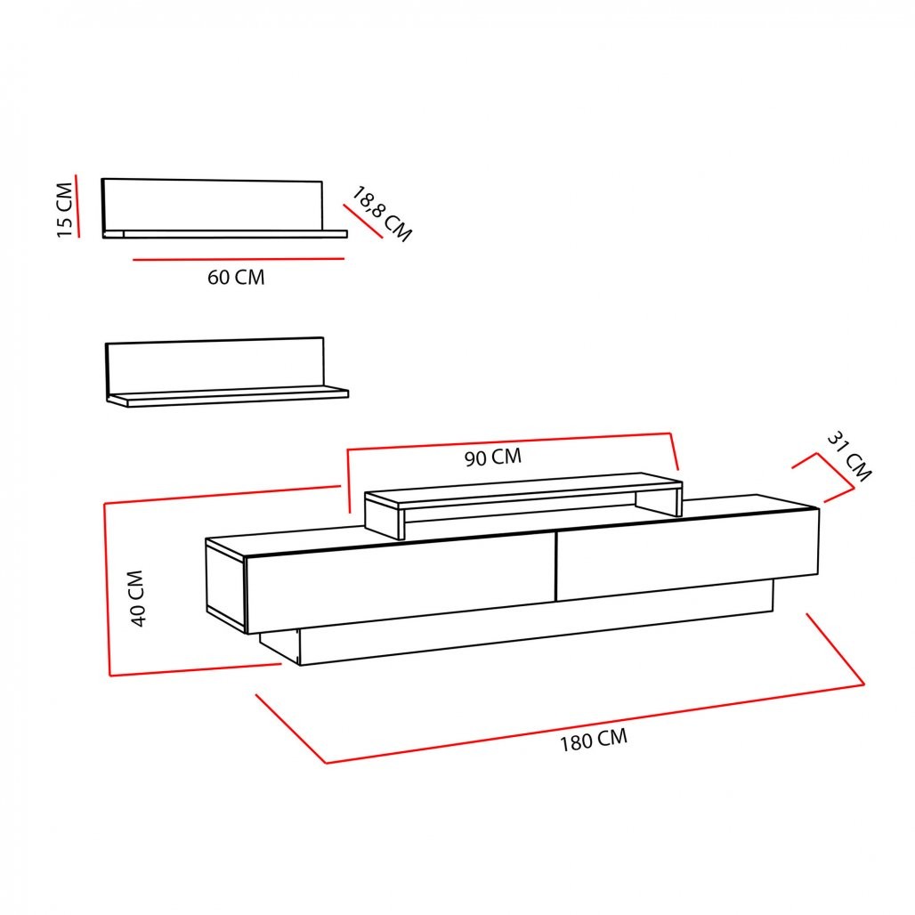 Ta televizijska enota ne samo, da izboljšuje estetiko vaše dnevne sobe, ampak ponuja tudi praktičnost.Z lahkoto ga je mogoče pritrditi na steno, kar zagotavlja stabilnost in varnost.Dimenzije enote s širino 180 cm, višino 40 cm in globino 31 cm so primerne za kakršno koli velikost sobe.