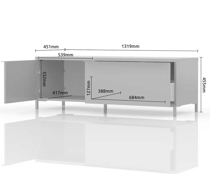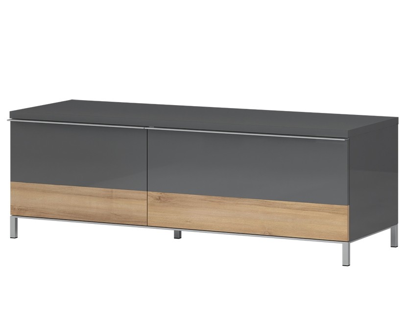 TV regal je na vseh zunanjih delih premazan z UV lakom, ki ustvari visoki sijaj. Visoki sijaj nudi pohištvu bolj eleganten in prefinjen videz, zato bo vaša dnevna soba vedno izgledala odlično in bo v središču pozornosti.