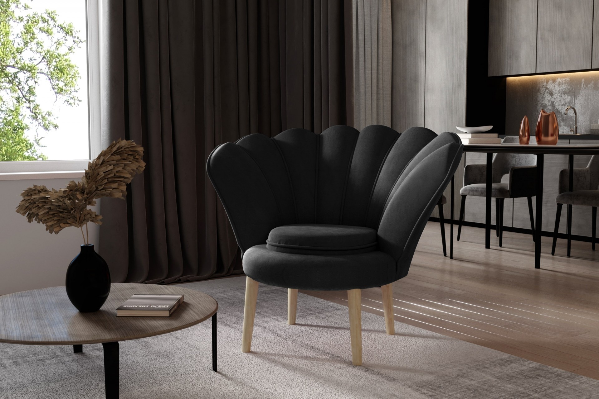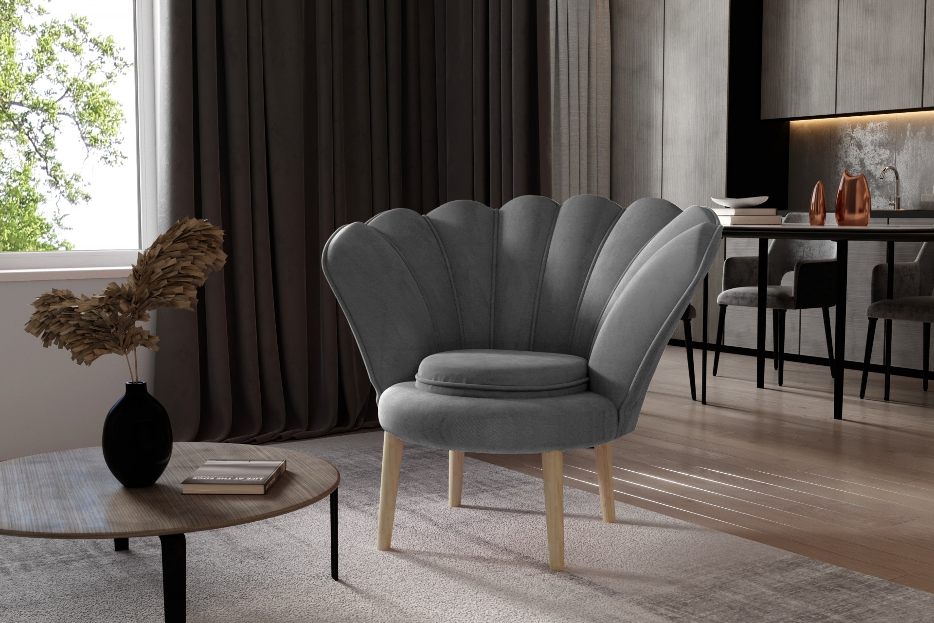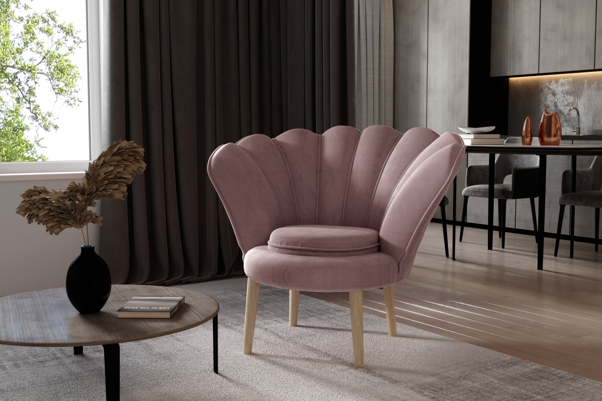 Iščete unikaten kos pohištva, ki bo osvežil vaš dom in vanj prinesel več modernega sloga? Fotelj Vivien je kot nalašč za vas, saj ni podoben običajnim foteljem in postane središče pozornosti v vsaki sobi! Unikatno hrbtišče spominja na veliko školjko z biseri, ki je simbol elegance in bogastva.