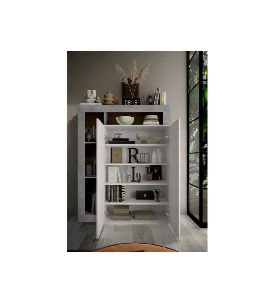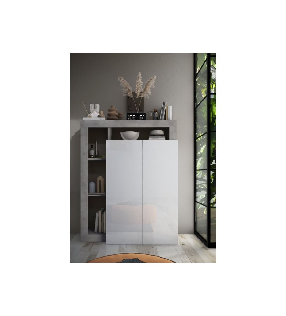 Večnamenska omara za čevlje HAMBURG 409030-44CE je idealna rešitev za organizacijo vašega doma. S svojim sodobnim dizajnom v kombinaciji bele barve visokega sijaja in betonskega videza prinaša eleganco in funkcionalnost v vsak prostor. Dvovratna omara ponuja dovolj prostora za shranjevanje čevljev ali drugih predmetov, kar jo naredi vsestransko uporabno.