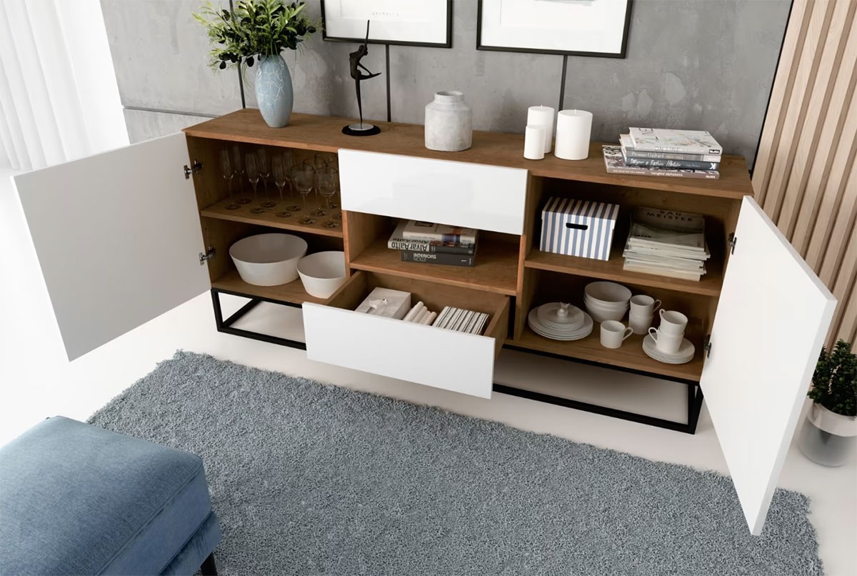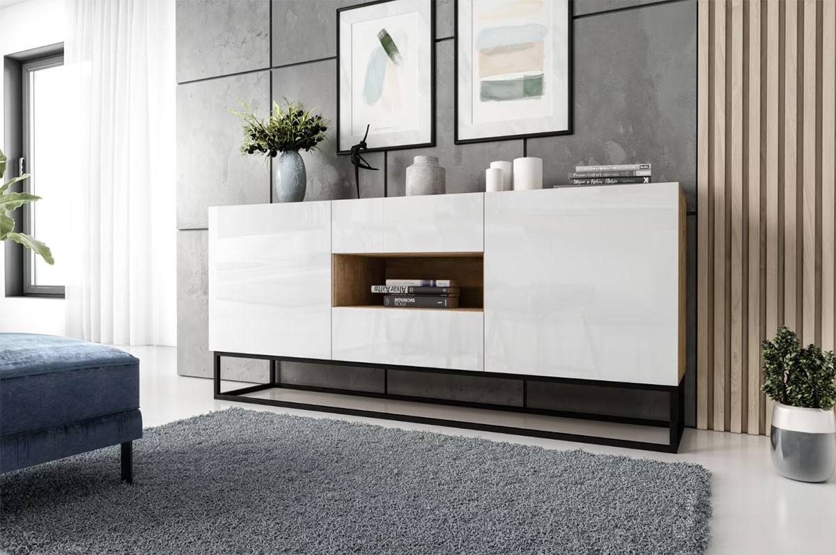 Velika komoda AVORIO je praktična in modernega izgleda. Komoda vsebuje veliko shranjevalnega prostora, saj nudi dva predala, dvoje vrat in polico kamor lahko pospravite knjige, družabne igre in ostale stvari. Na voljo je v kombinaciji hrasta in bele barve visokega sijaja.